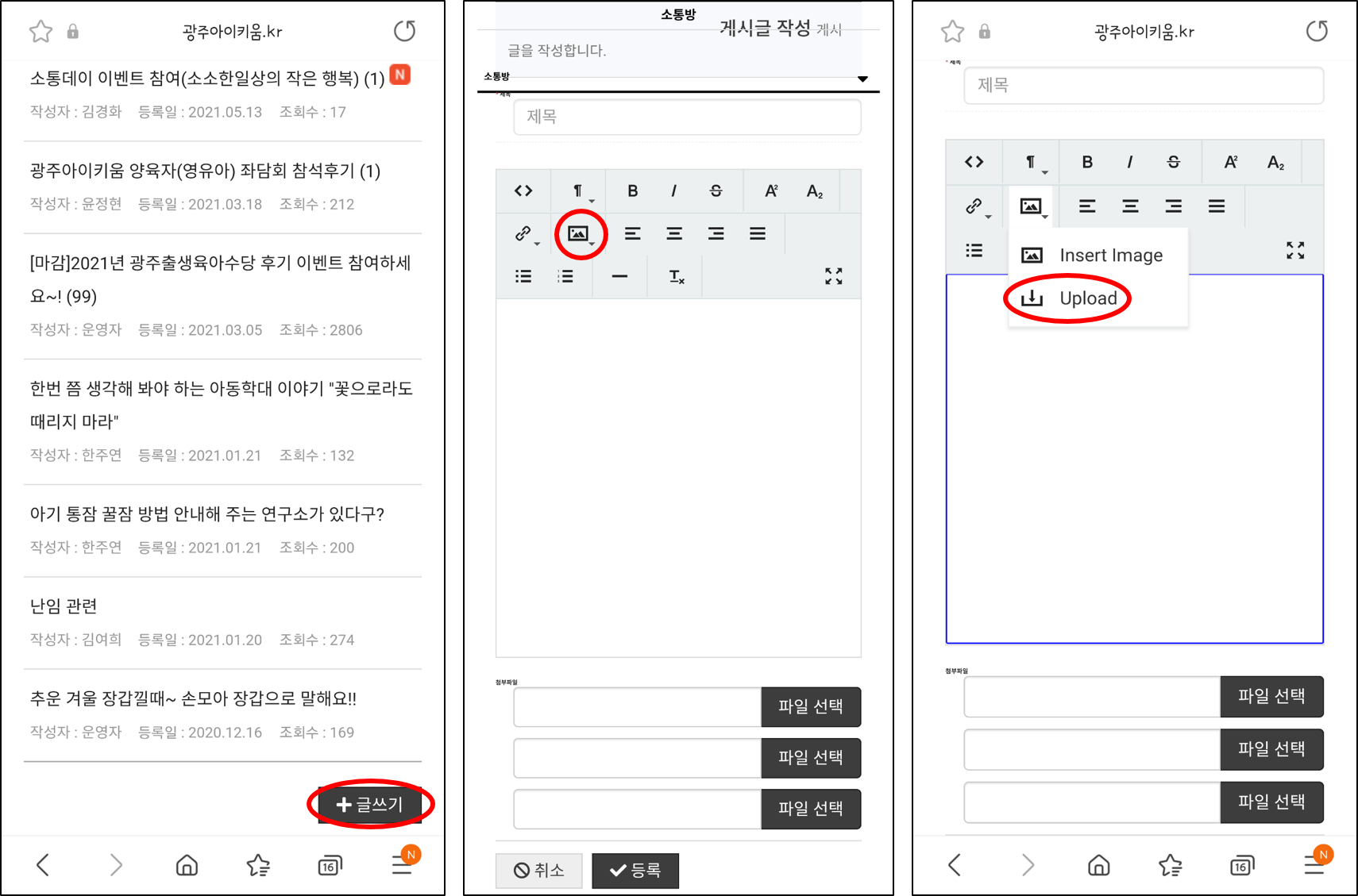 핸드폰의 경우 로그인 후 글쓰기 클릭