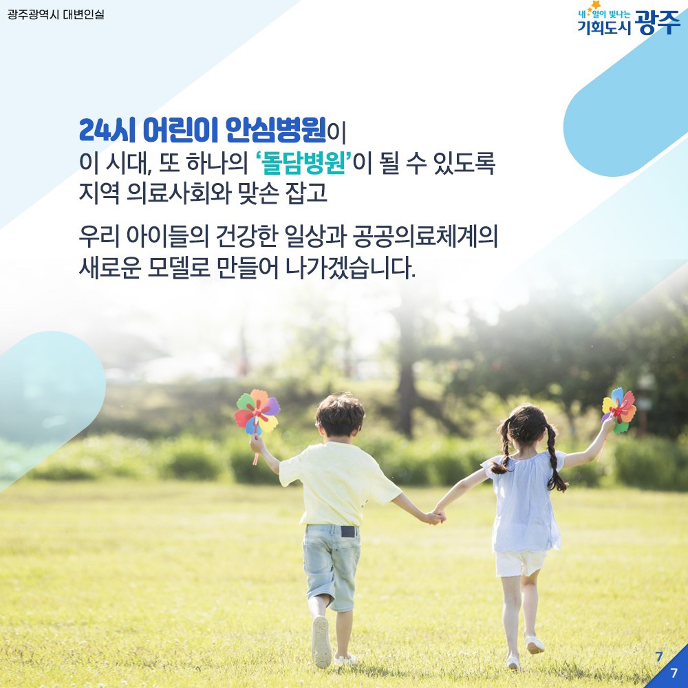 어린이 의료체계 모델을 구축하고, 광주다움 통합돌봄을 결합한 24시 어린이 안심병원을 조성합니다.