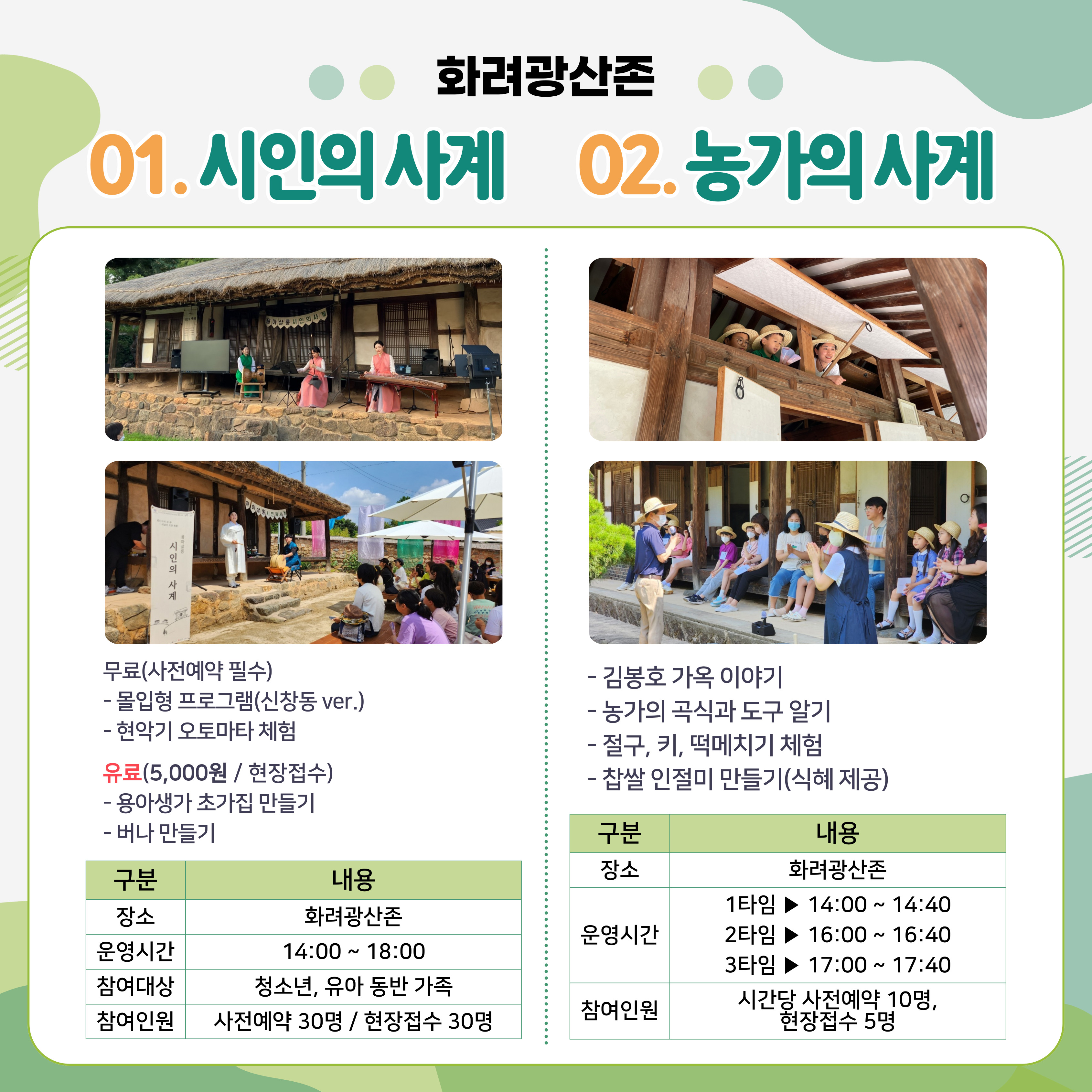 - 내용 : 김봉호 가옥 이야기, 농가 곡식 체험, 떡메치기 체험, 찹쌀 인절미 만들기(식혜 제공)