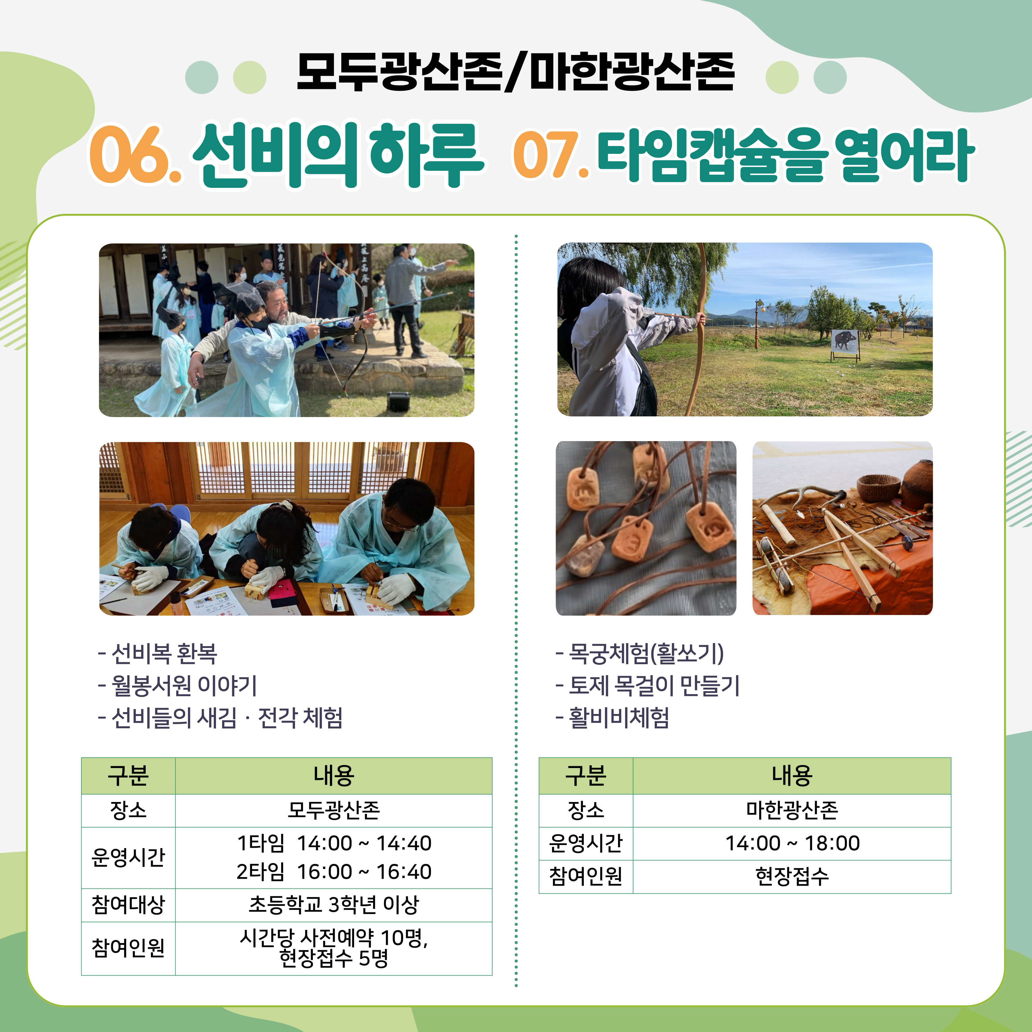 - 내용 : 목궁체험(활쏘기), 토제 목걸이 만들기, 활비비 체험