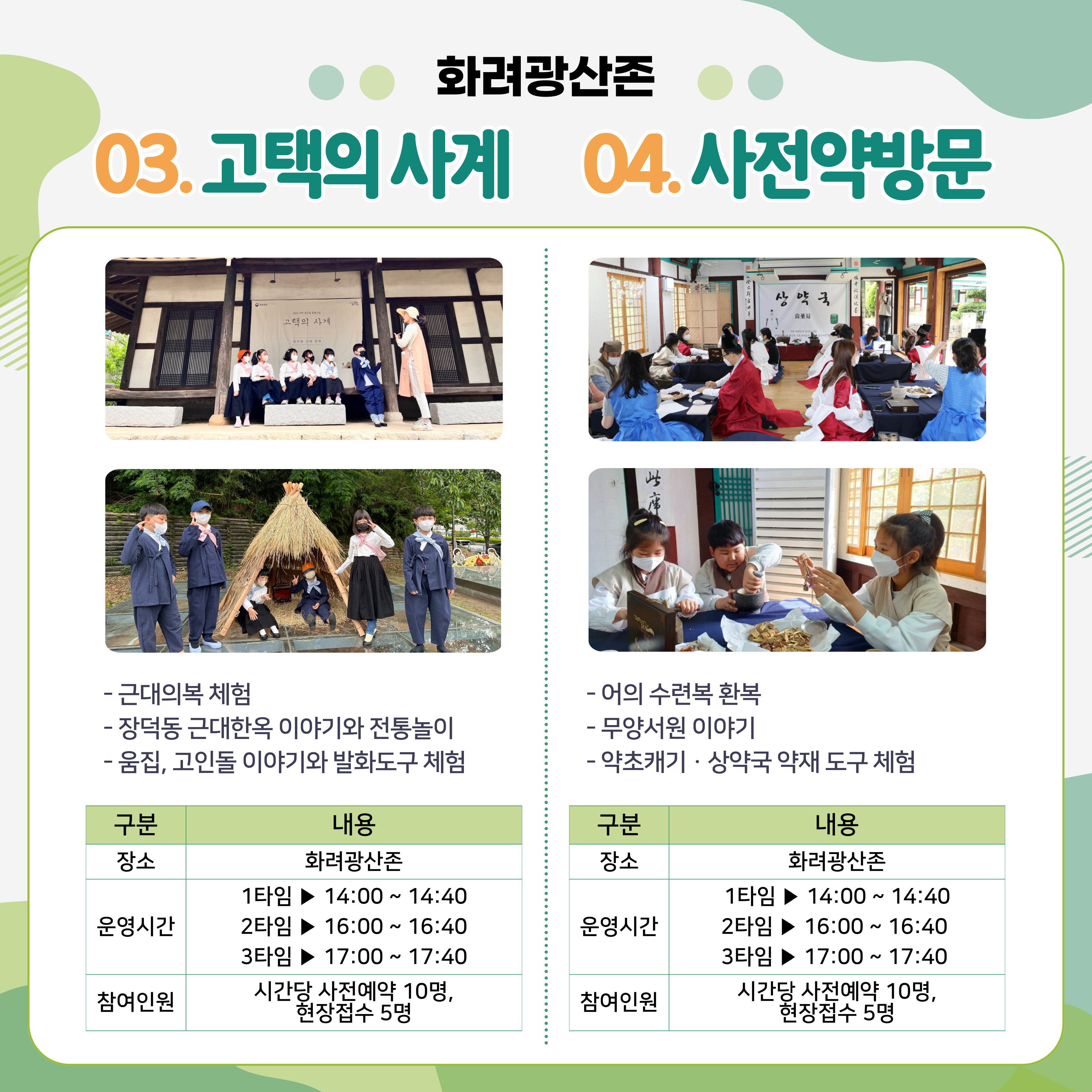 - 내용 : 무양서원 이야기, 어의복 환복, 약초캐기, 상약국 약재 도구 체험