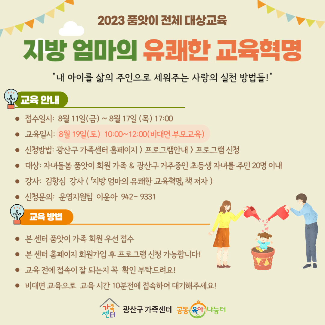 행사내용 지방 엄마의 유쾌한 교육혁명 : 내 아이를 삶의 주인으로 세워주는 사랑의 실천 방법