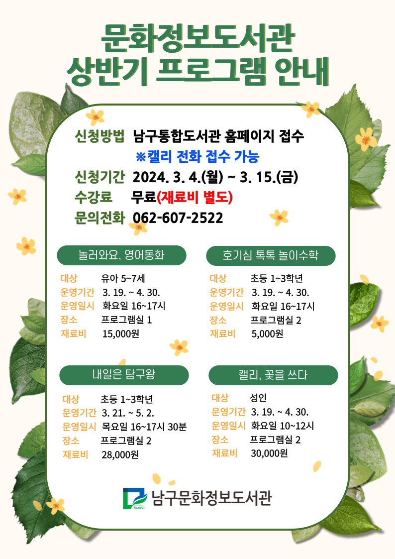 [남구문화정보도서관] 문화정보도서관 상반기 수강생 모집