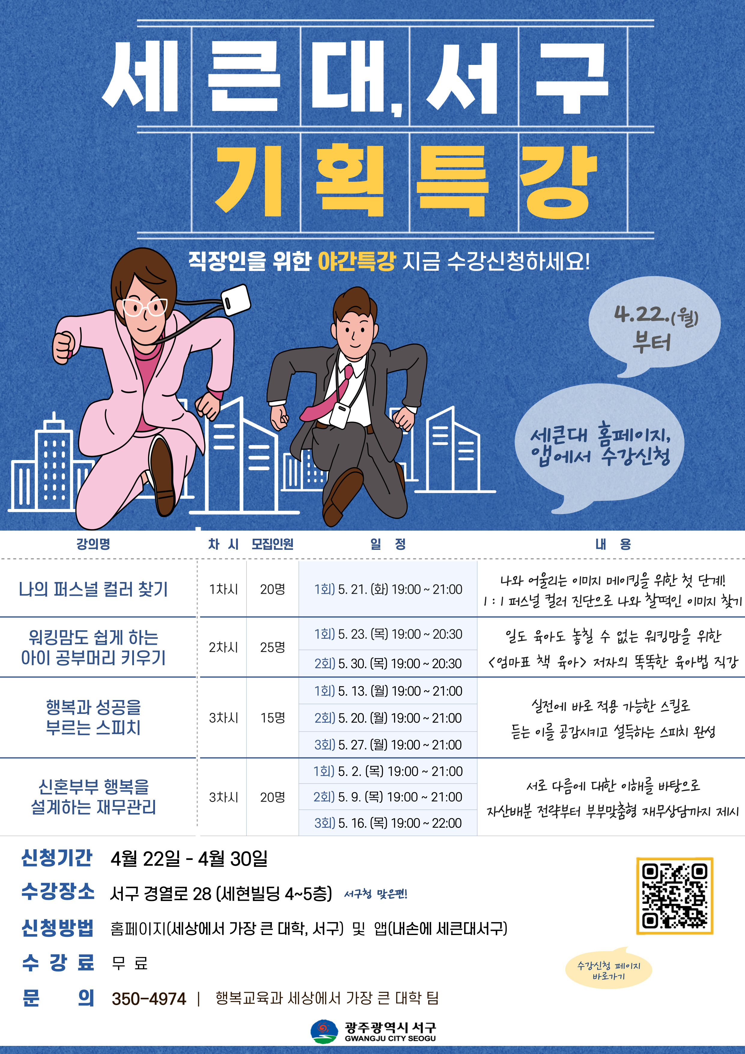 [서구]<세큰대> 기획특강 수강신청하세요~✍️ 등록일 : 2024-04-22 17:21 카테고리 : 카테고리 없음 작성자 : 운영자 조회수 : 220 세상에서 가장 큰 대학, 서구에서직장인들을 위해 야간특강을 준비했어요~!○신청기간 : 4. 22. ~ 4. 30.○수강장소 : 서구 경열로 28(세현빌딩 4~5층)○수강료 : 무료○신청방법 : 세큰대 홈페이지 및 앱(내손에 세큰대서구)https://365edu.seogu.gwangju.kr/index.9is○문 의 : 세상에서 가장 큰 대학 팀 (☎350-4974)[출처] 광주 서구청 목록