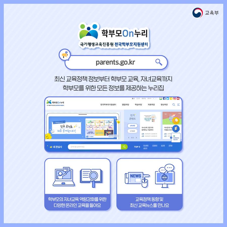 학부모가 알아두면 좋은 유용한 교육정보 누리집! 등록일 : 2024-07-09 13:06 카테고리 : 카테고리 없음 작성자 : 운영자 조회수 : 155 학부모가 알아두면 좋은 유용한 교육정보 누리집!우리 아이 교육에 대한 다양한 정보 꼼꼼하게 확인하고, 궁금증 해결하세요! <출처> 교육부 목록