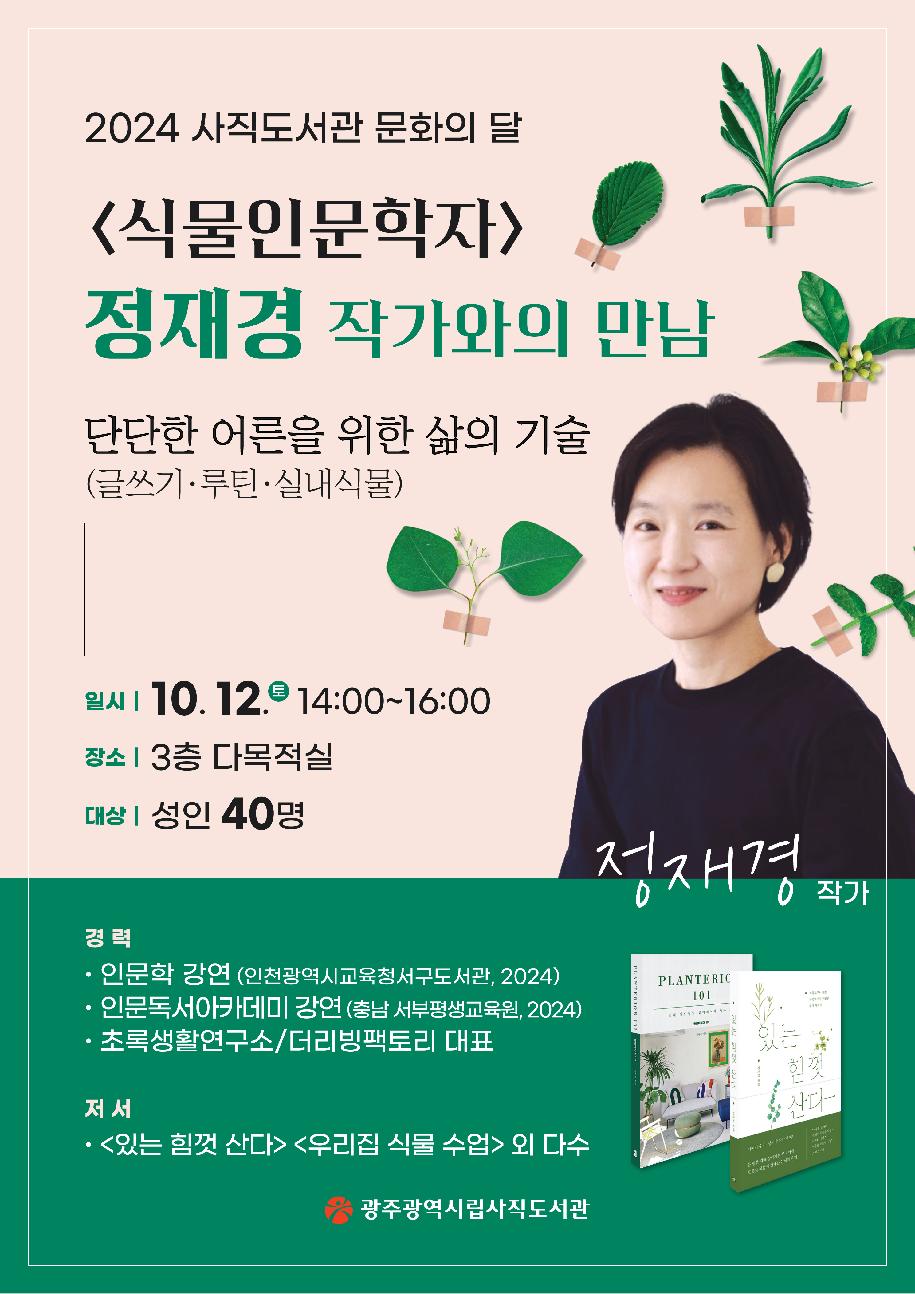 [사직도서관] '식물인문학자' 정재경 작가와의 만남 안내 등록일 : 2024-09-30 09:19 카테고리 : 카테고리 없음 작성자 : 운영자 조회수 : 156 사직도서관에서 '식물인문학자' 정재경 작가와의 만남을 진행합니다.관심 있는 분들의 많은 참여 부탁드립니다. ^^ㅇ일시 : 10. 12.(토) 14:00~16:00 ㅇ장소 : 사직도서관 3층 다목적실[출처 : 광주광역시] 목록