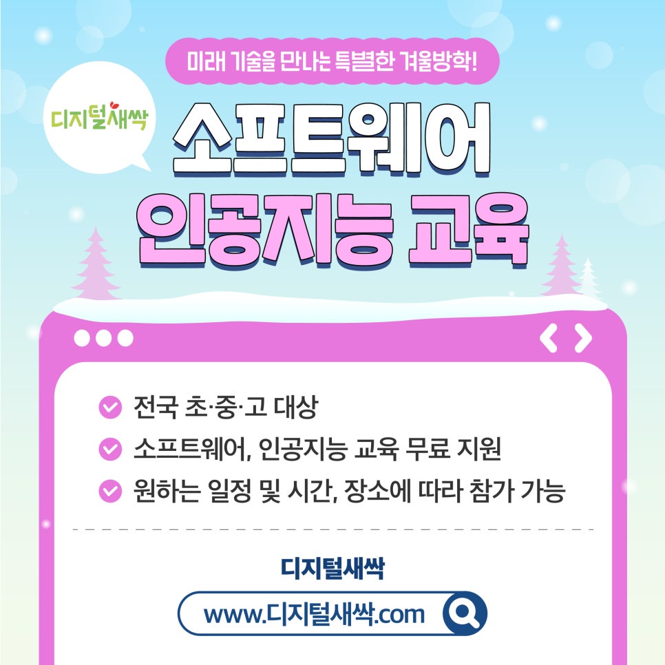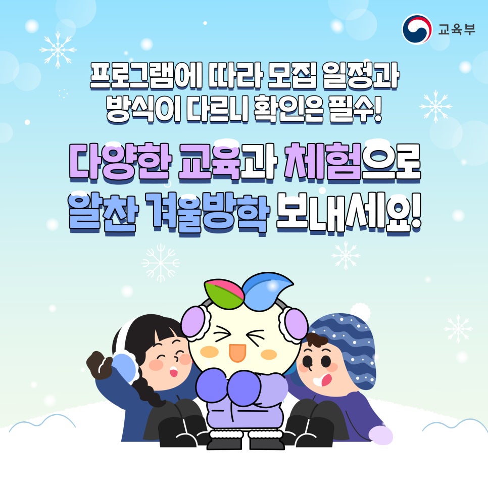[교육부] 겨울방학 교육·체험 프로그램 소개 등록일 : 2025-01-09 17:05 카테고리 : 카테고리 없음 작성자 : 운영자 조회수 : 122 첨부파일 0108_2024년_겨울방학_교육체험_프로그램_1.jpg 다운로드 프로그램에 따라 모집 일정과방식이 다르니 확인은 필수!다양한 교육과 체험으로알찬 겨울방학 보내세요~⛄❄[출처] 꾸미가 알려주는 겨울방학 교육·체험 프로그램|작성자 교육부 목록