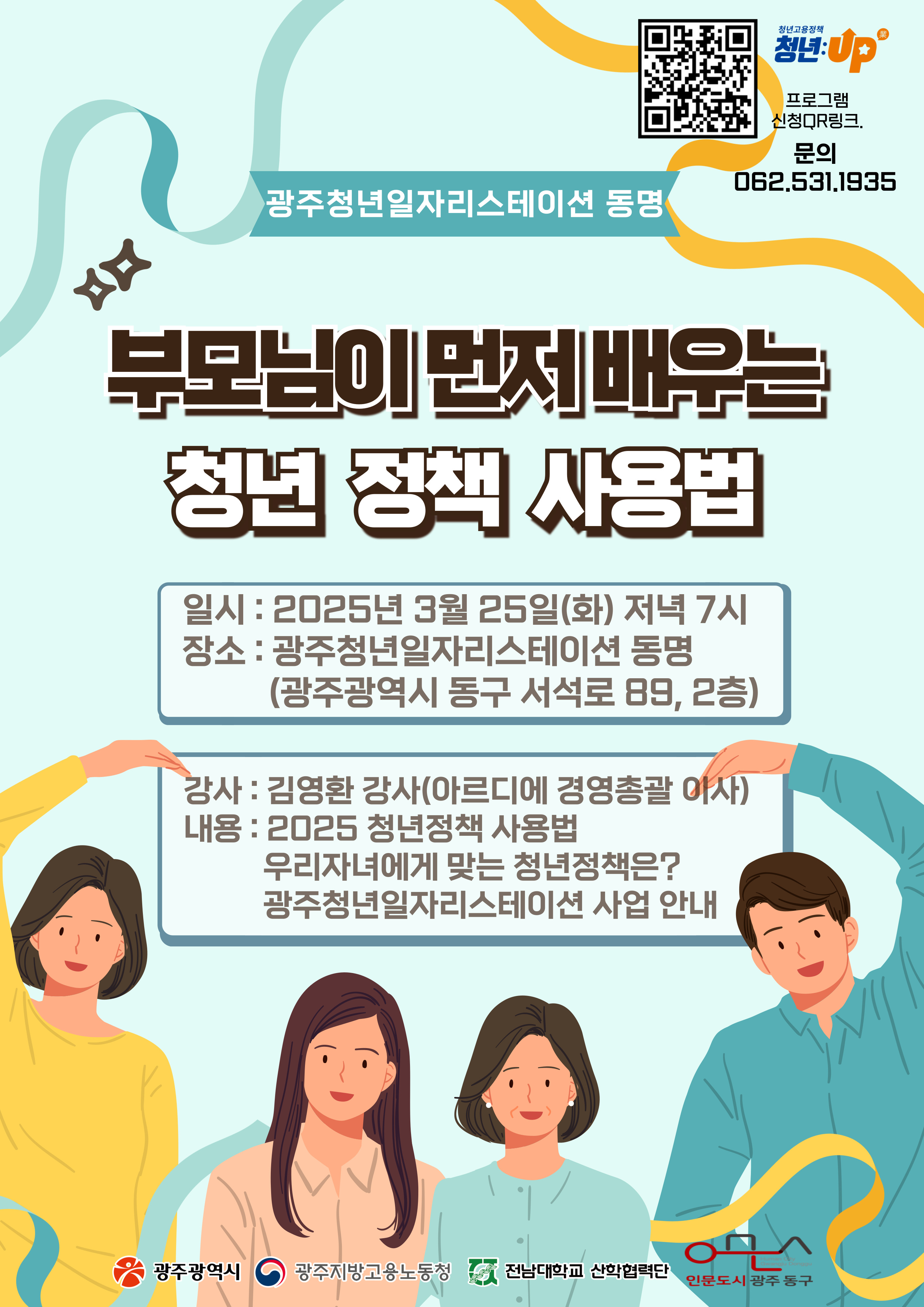 광주청년일자리스테이션 동명에서 청년자녀를 둔 부모를 대상으로 청년정책사업을 소개하는 '부모 교육 프로그램'을 진행하오니 적극적으로 참여 바랍니다.
