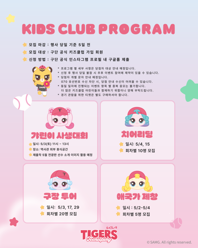 [KIA타이거즈] ⚾미리 갸린이날 키즈클럽 안내 등록일 : 2025-05-02 09:57 카테고리 : 카테고리 없음 작성자 : 운영자 조회수 : 75 첨부파일 기아.png 다운로드 📍 경기 관람을 위한 티켓은 별도 구매 기간: 05.02 (금) ~ 05.04.(일) 장소: 광주 - 기아 챔피언스필드 내용: 홈련볼 과자 증정, 티니핑 예어벌룬 • 등신대 • 포토월 등 [출처: 기아 타이거즈] 목록