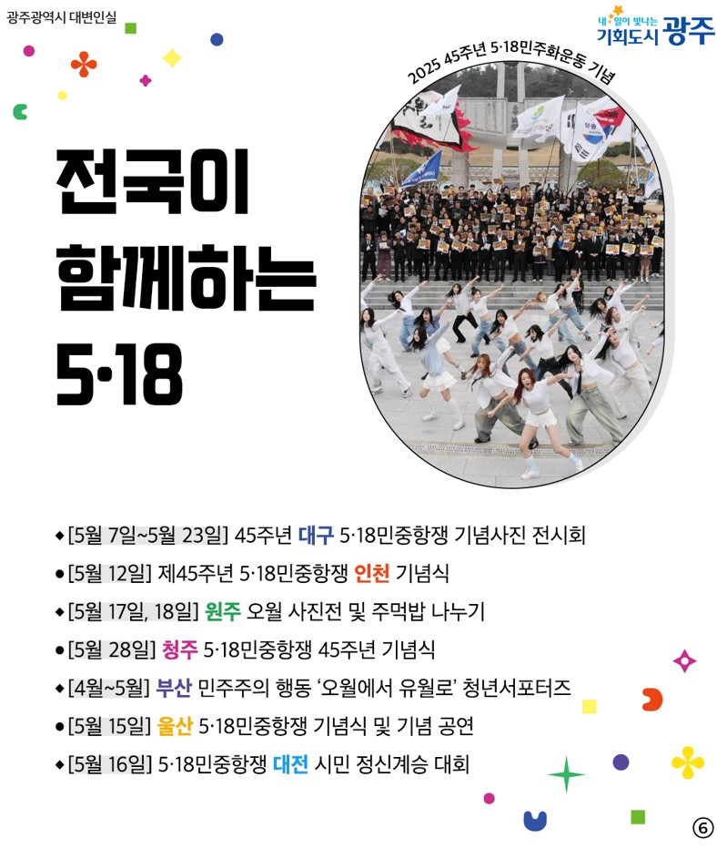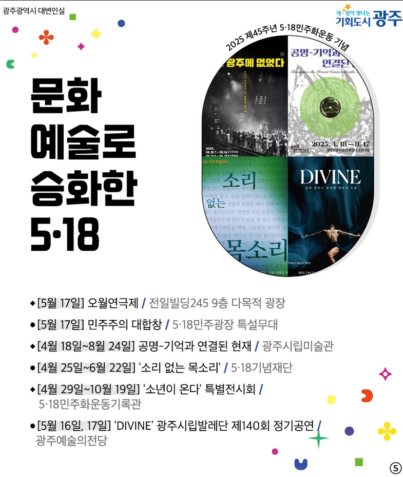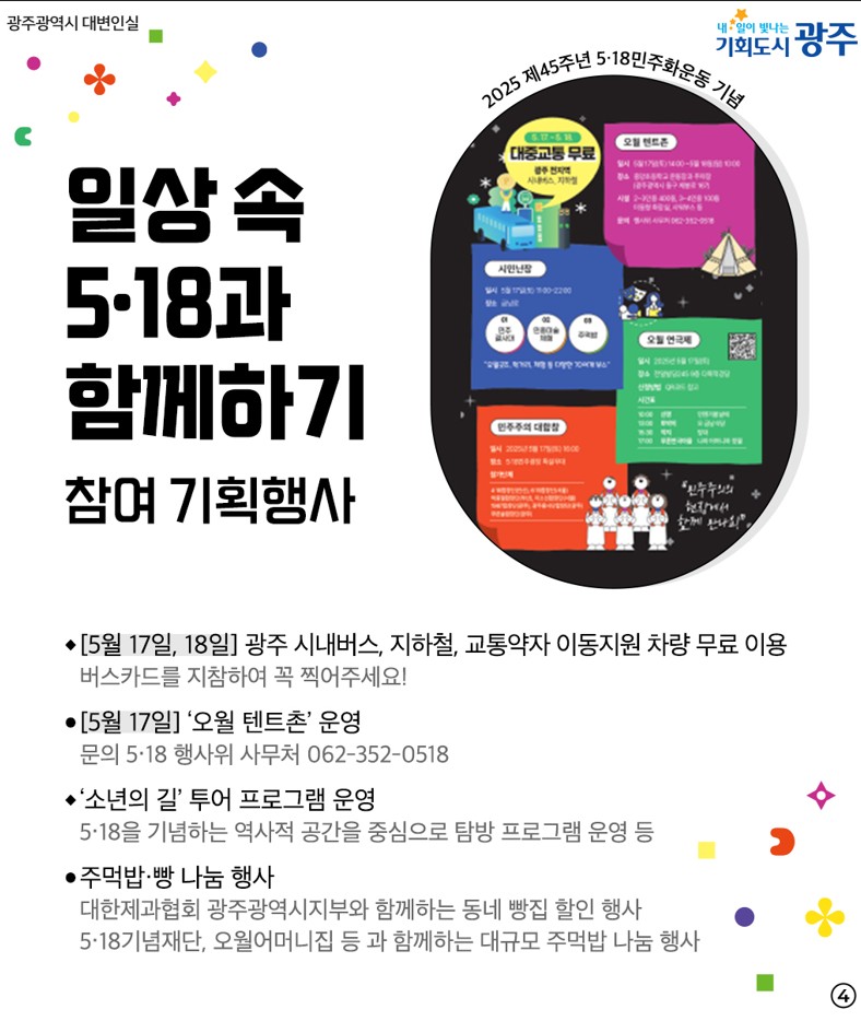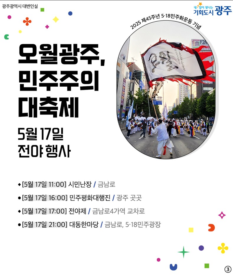 ✨오월 광주, 민주주의 대축제에 당신을 초대합니다 ! ✨ 등록일 : 2025-05-07 09:35 카테고리 : 카테고리 없음 작성자 : 운영자 조회수 : 62 첨부파일 오월.jpg 다운로드 제 45주년 5 · 18 민주화운동 기념 '아! 오월 다시 만난 오월'오월 광주, 민주주의 대축제에 당신을 초대합니다 !05.17 ~ 05.18 광주에서 누릴 수 있는 많은 행사와 혜택을 놓치지 마세요 😊[출처: 광주광역시청] 목록