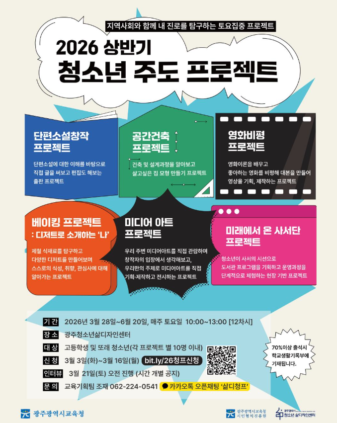 home 맘편한 내★일, 광주아이키움2.0 결혼·임신·출생 영유아 초·중·고 다양한 가족 일생활균형 커뮤니티 아동돌봄지원 소통방 나눔방 광주 아이키움 상담방 돌봄정보방 성폭력 피해 지원 안내 공지사항 우리동네 돌봄정보 기관별 공지사항 2026 상반기 청소년 주도 프로젝트 등록일 : 2026-03-04 18:10 카테고리 : 카테고리 없음 작성자 : 운영자 조회수 : 98 지역사회와 함께 내 진로를 탐구하는 토요집중 프로젝트 2026년 3월 28일~6월20일 매주 토요일 카카오톡오픈채팅방 '삶디청프' 로 오세요^^ 목록