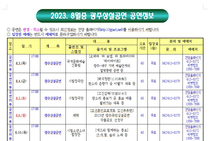 ○ 문의전화 : 광주예술의전당 공연지원과 상설공연팀 (☎062-613-8372/9379)