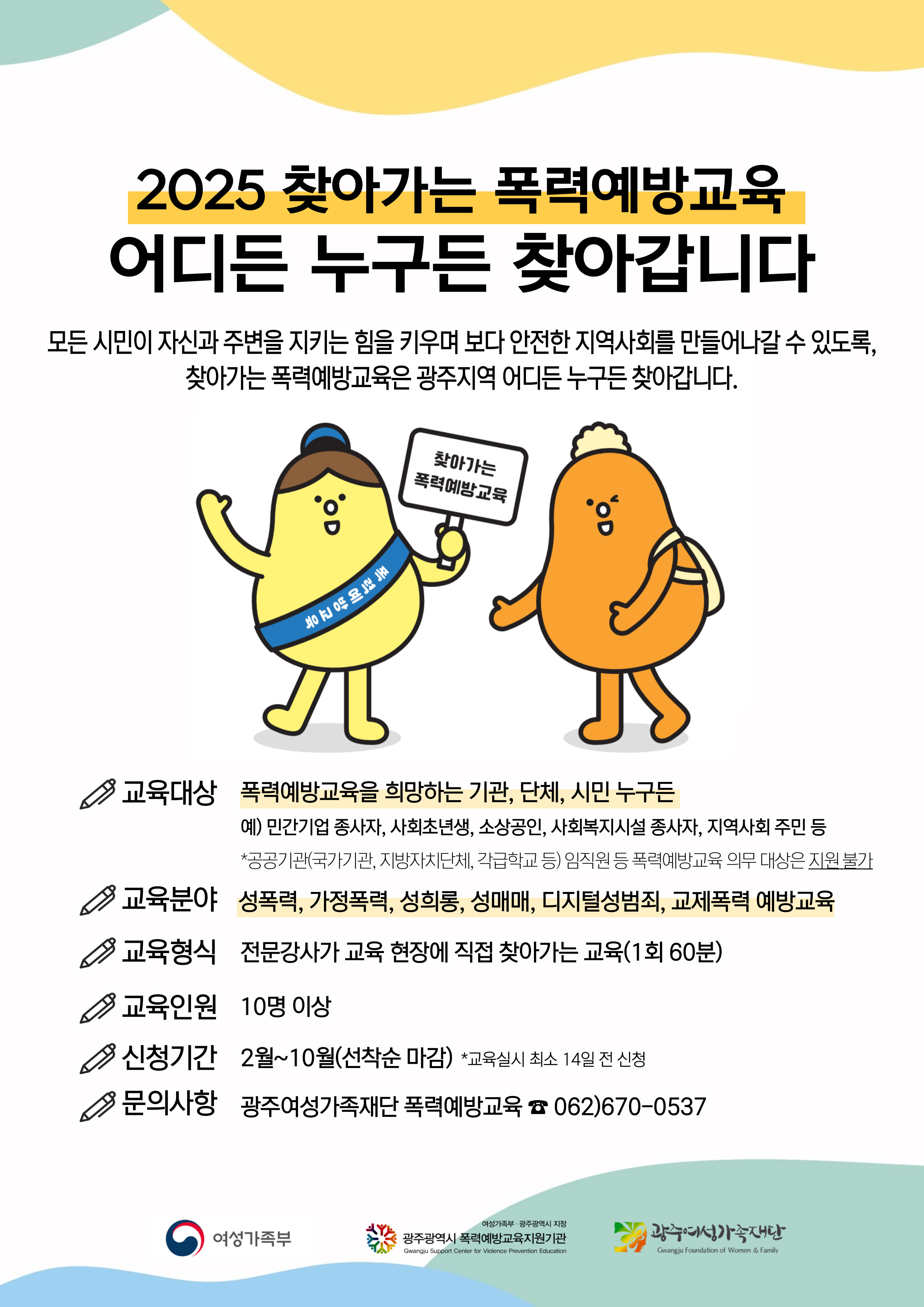 [교육모집]‘2025년 찾아가는 폭력예방교육’ 등록일 : 2025-07-07 13:40 카테고리 : 카테고리 없음 작성자 : 운영자 조회수 : 48 ‘2025년 찾아가는 폭력예방교육’ 어디든 누구든 찾아갑니다!광주여성가족재단▣ 교육 개요 - 교육대상: 희망하는 기관, 단체, 시민 누구든 * 공공기관 등 의무대상 불가 - 교육분야: 성폭력, 가정폭력, 성희롱, 성매매, 디지털성범죄, 교제폭력 예방교육 - 교육형식: 전문강사가 교육 현장에 직접 찾아가는 교육(1회 60분) - 교육인원:10명 이상 - 신청기간: 2월~10월(선착순 마감) * 교육실시 최소 14일 전 신청 목록