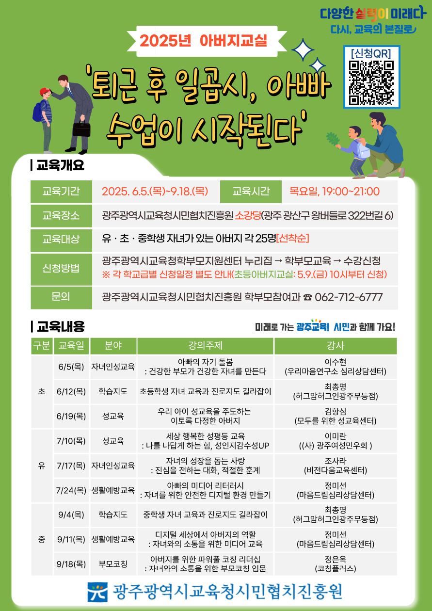 [광주광역시교육청 시민협치진흥원] 2025년 아버지교실 등록일 : 2025-08-11 14:26 카테고리 : 카테고리 없음 작성자 : 운영자 조회수 : 37 [출처 : 광주광역시교육청] 목록
