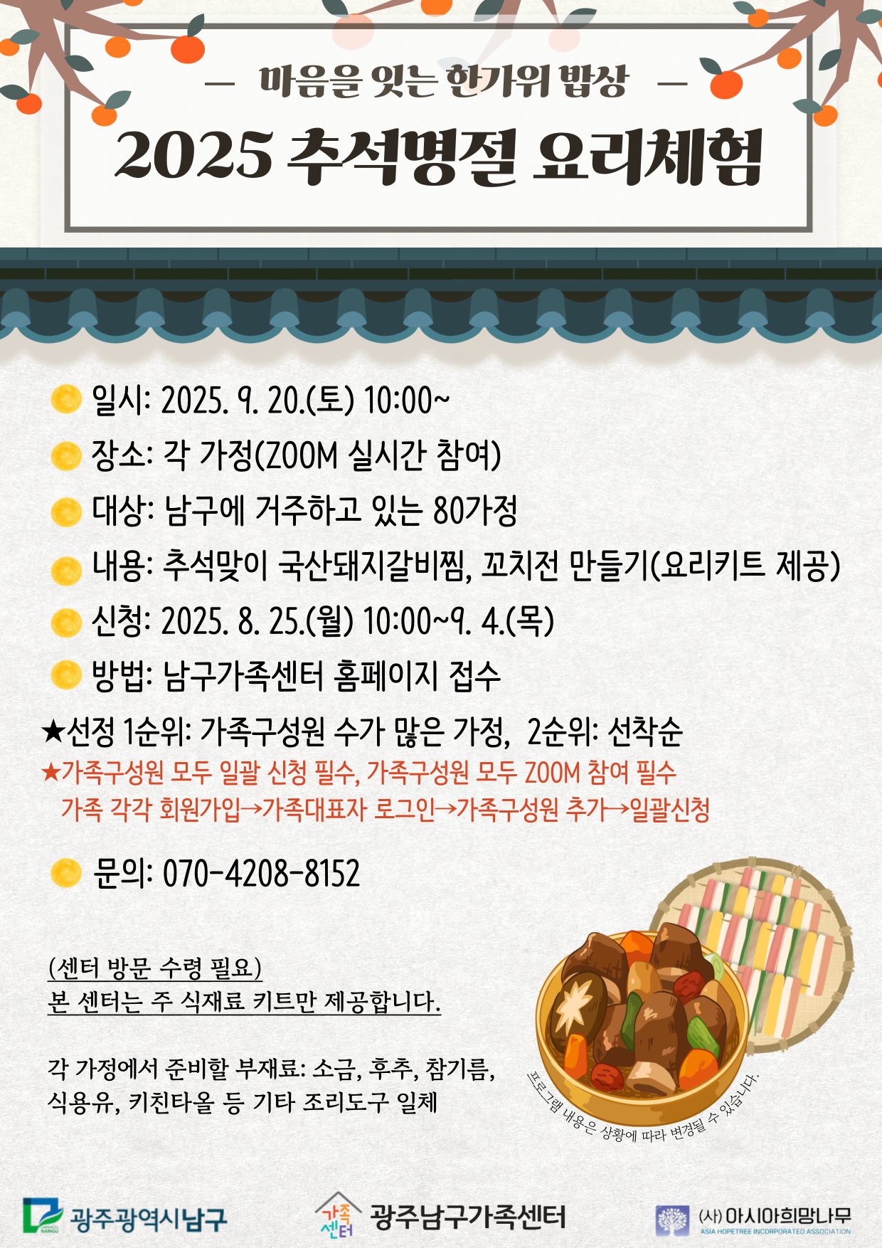 [광주남구가족센터] 2025 추석명절 요리체험 등록일 : 2025-08-25 14:43 카테고리 : 카테고리 없음 작성자 : 운영자 조회수 : 43 [출처 : 광주남구가족센터] 목록