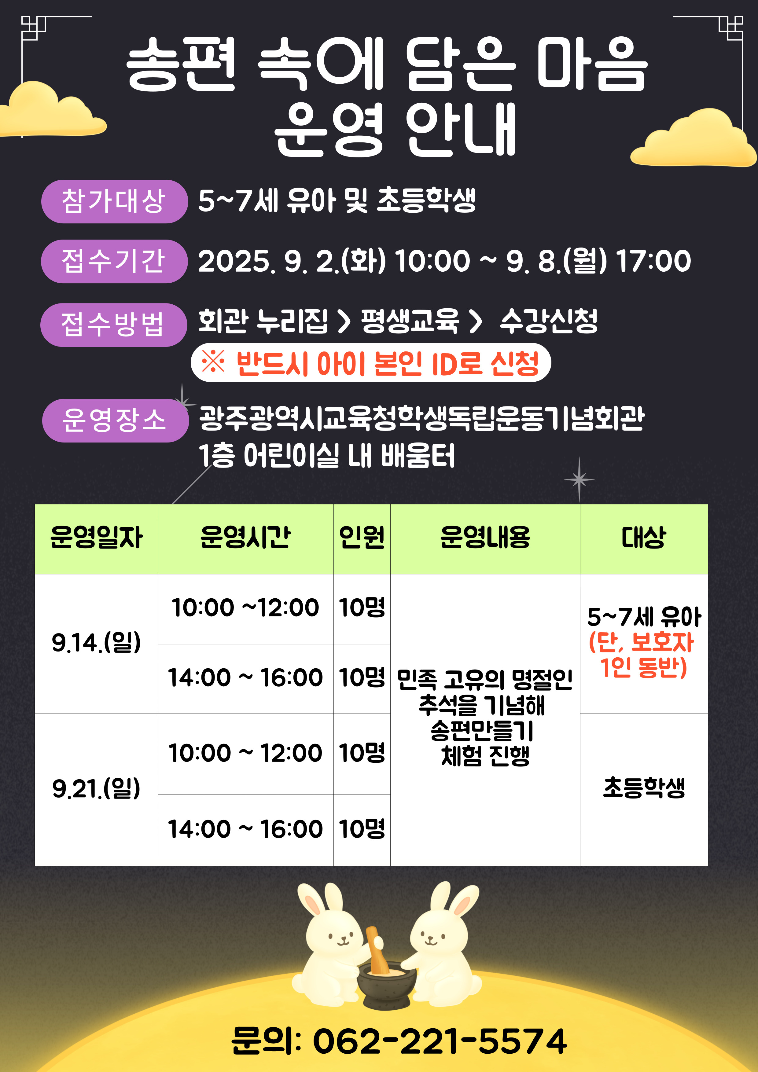 [광주광역시교육청 통합도서관] 송편 속에 담은 마음 등록일 : 2025-09-01 14:40 카테고리 : 카테고리 없음 작성자 : 운영자 조회수 : 38 [출처 : 광주광역시교육청 통합도서관] 목록