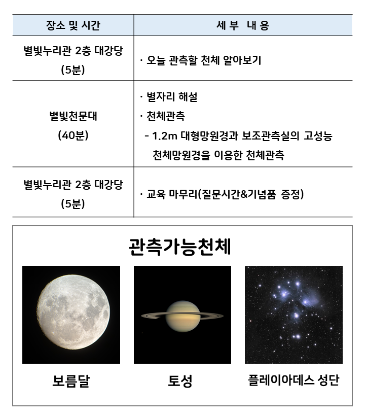 - 운영장소 : 별빛누리관 2층 대강당 및 별빛천문대