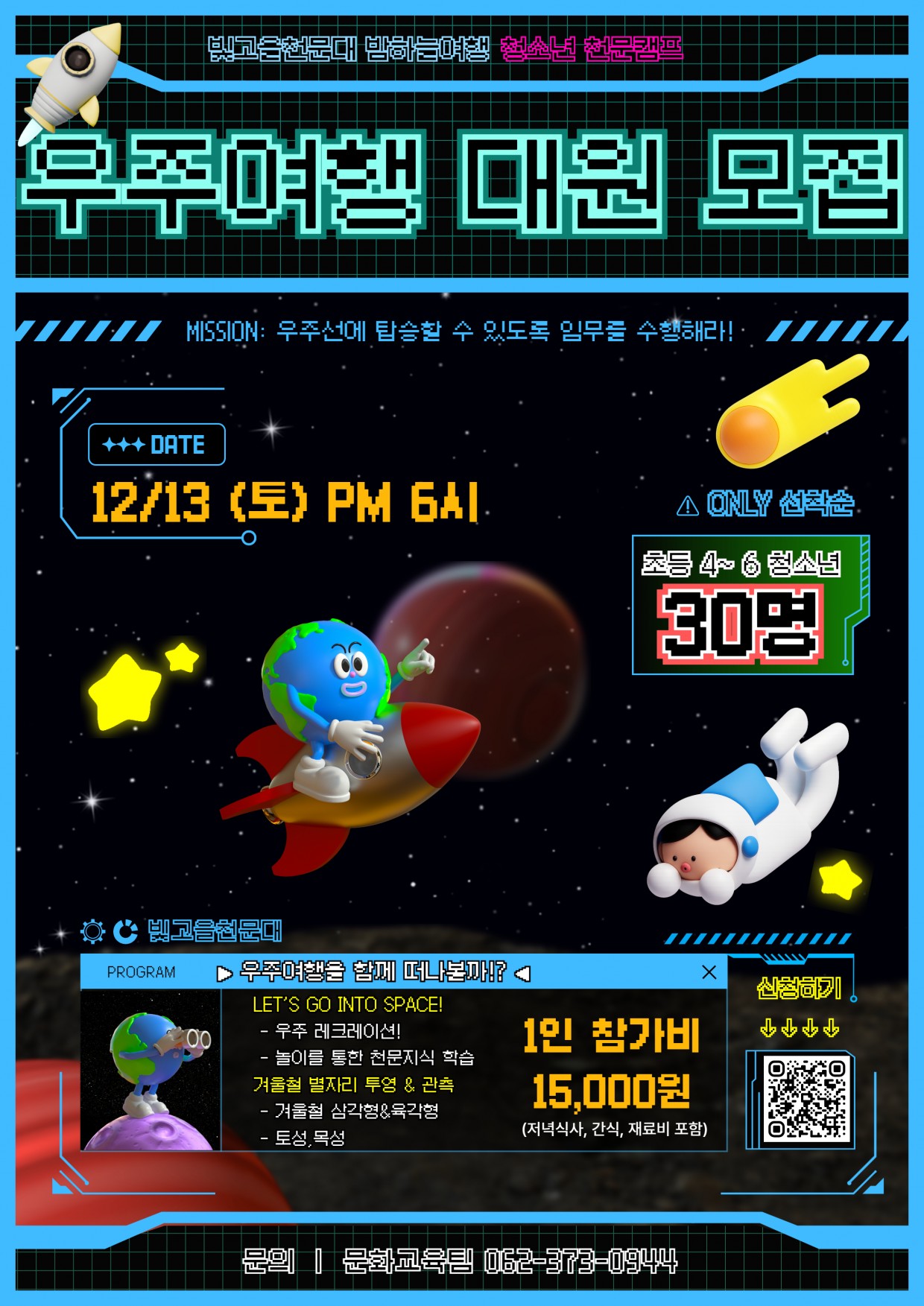 [빛고을천문대] 12/13 천문캠프 프로그램 안내 등록일 : 2025-11-24 14:35 카테고리 : 카테고리 없음 작성자 : 운영자 조회수 : 33 출처:광주광역시청소년수련원 빛고을천문대 목록