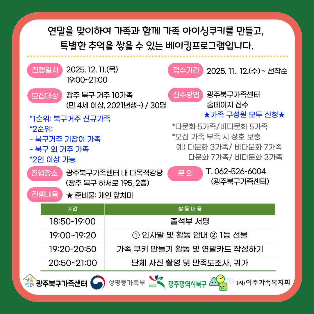 연말을 맞이하여 가족과 함께 가족 아이싱쿠키를 만들고, 특별한 추억을 쌓을 수 있는 베이킹프로그램 입니다.