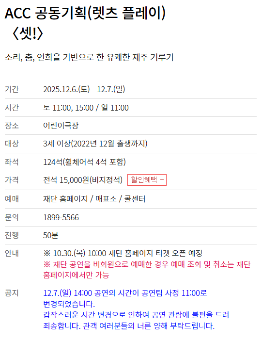 [ACC]ACC 어린이극장 공동기획 렛츠플레이 '셋!' 등록일 : 2025-11-28 11:07 카테고리 : 카테고리 없음 작성자 : 운영자 조회수 : 33 출처:국립아시아문화전당ACC 목록