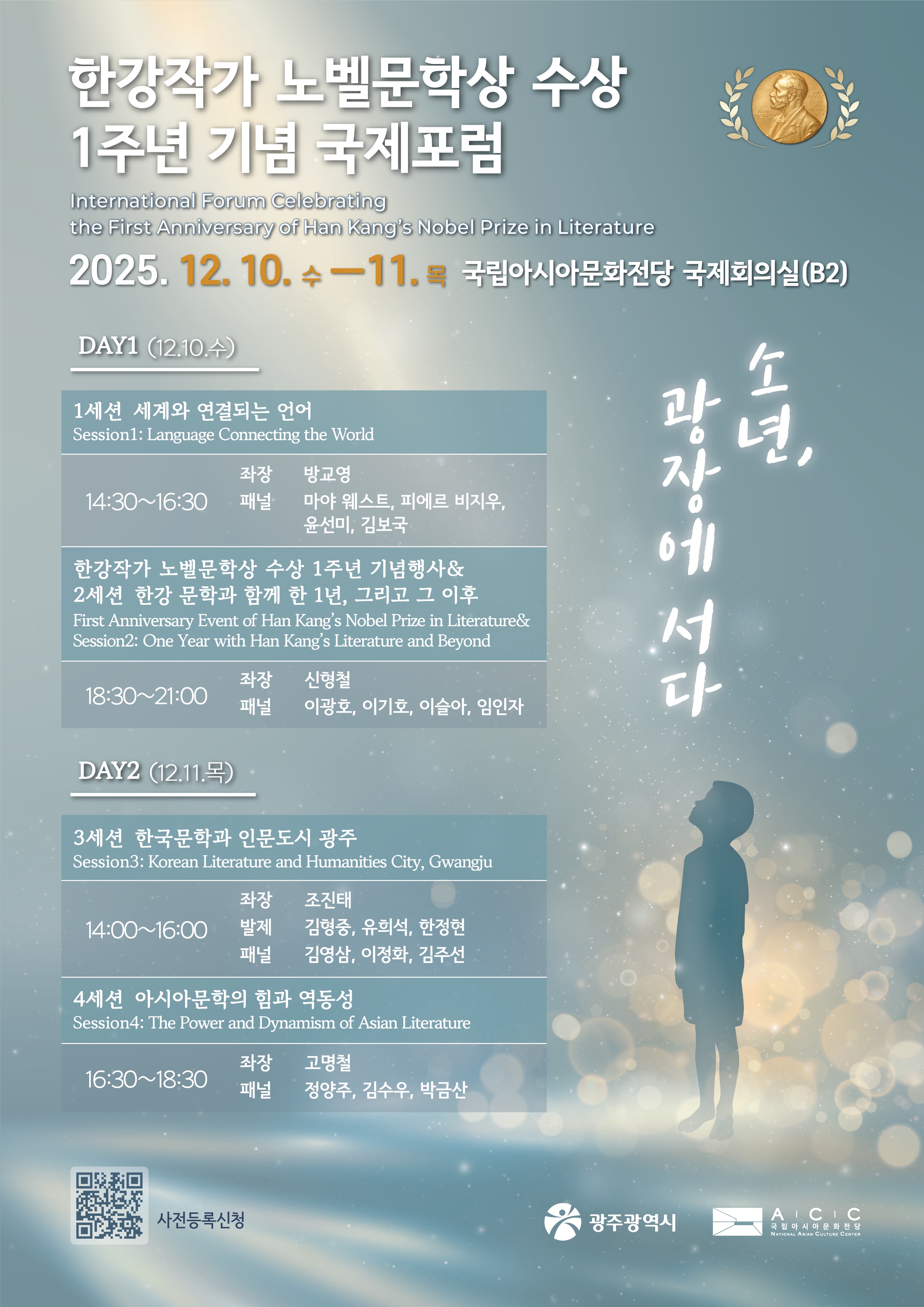 한강작가 노벨문학상 수상 1주년 기념 국제포럼 안내 등록일 : 2025-12-04 14:19 카테고리 : 카테고리 없음 작성자 : 운영자 조회수 : 26 광주광역시에서 개최하는 한강작가 노벨문학상 수상 1주년기념 국제 포럼을 안내드리니 관심있는 분들의 많은 참여 바랍니다. 출처:광주서구통합도서관 목록