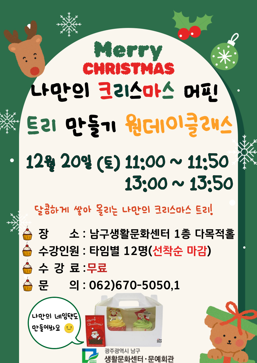 [남구생활문화센터]나만의 크리스마스 머핀 트리 만들기 등록일 : 2025-12-12 14:34 카테고리 : 카테고리 없음 작성자 : 운영자 조회수 : 31 출처:남구생활문화센터문예회관 목록