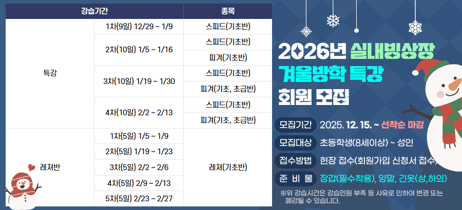실내빙상장 2026년 겨울방학 특강 회원 모집 안내