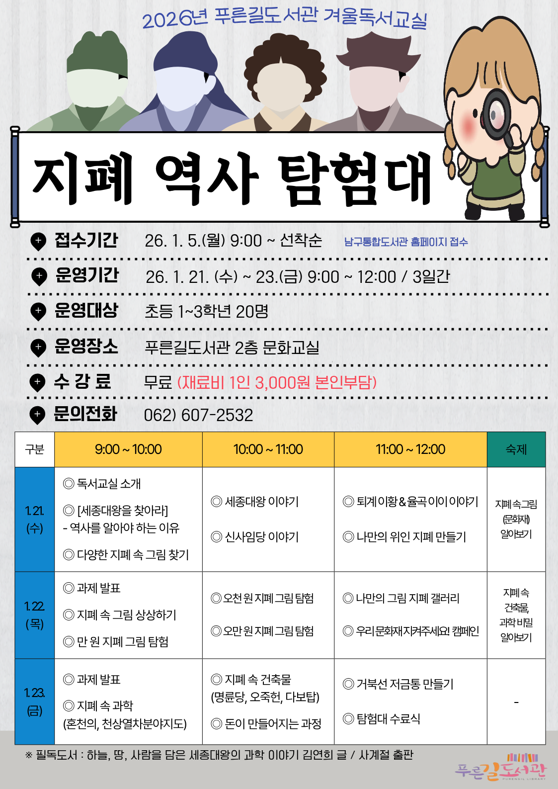 home 맘편한 내★일, 광주아이키움2.0 결혼·임신·출생 영유아 초·중·고 다양한 가족 일생활균형 커뮤니티 아동돌봄지원 소통방 나눔방 광주 아이키움 상담방 돌봄정보방 성폭력 피해 상담 및 사건지원 공지사항 우리동네 돌봄정보 기관별 공지사항 [푸른길도서관]2026년 겨울독서교실 '지폐 역사 탐험대' 등록일 : 2025-12-29 10:38 카테고리 : 카테고리 없음 작성자 : 운영자 조회수 : 50 출처:남구통합도서관 출처:남구통합도서관 목록