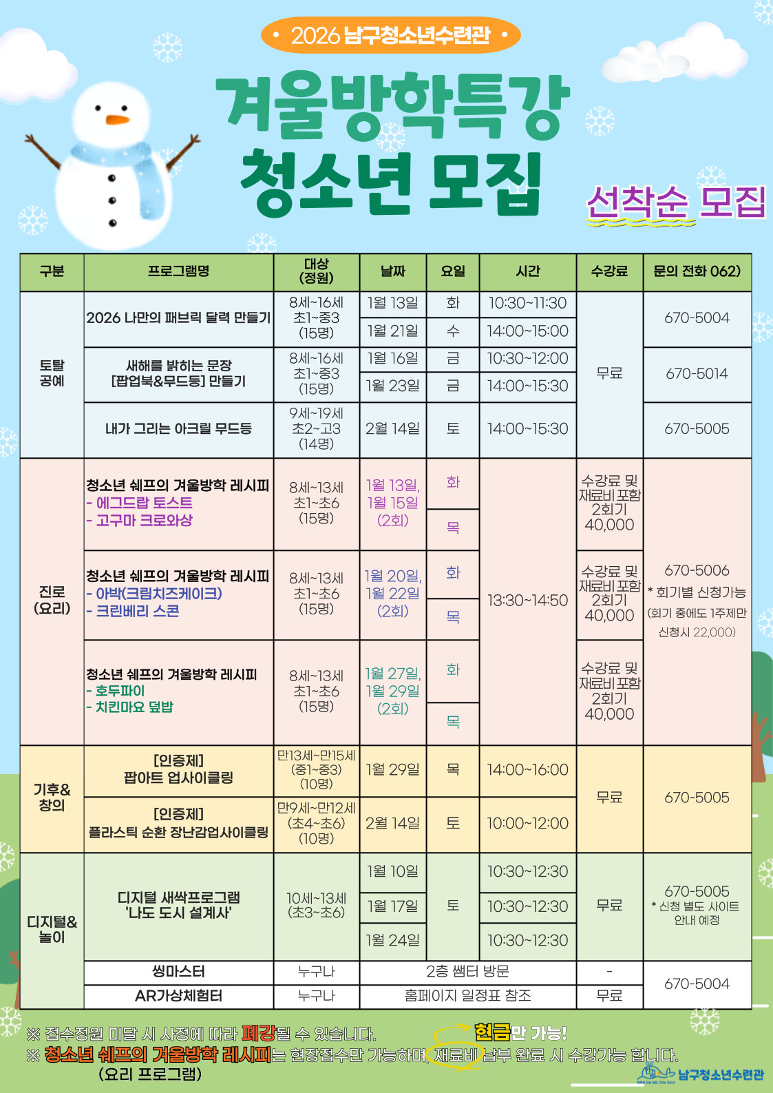 home 맘편한 내★일, 광주아이키움2.0 결혼·임신·출생 영유아 초·중·고 다양한 가족 일생활균형 커뮤니티 아동돌봄지원 소통방 나눔방 광주 아이키움 상담방 돌봄정보방 성폭력 피해 상담 및 사건지원 공지사항 우리동네 돌봄정보 기관별 공지사항 [광주남구청소년수련관]2026 겨울방학특강 청소년 모집 등록일 : 2026-01-05 13:40 카테고리 : 카테고리 없음 작성자 : 운영자 조회수 : 43 출처:광주남구청소년수련관 목록