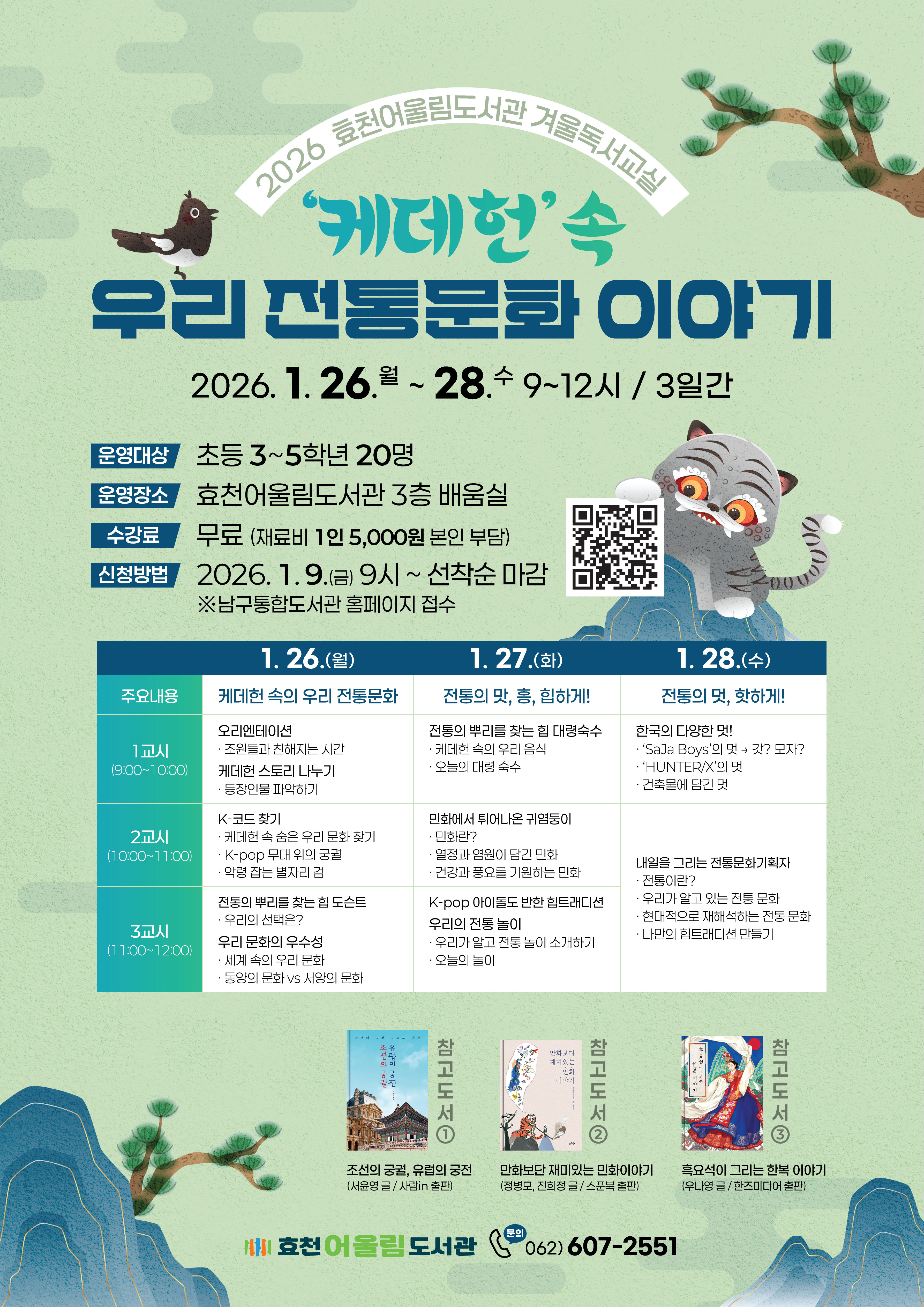 home 맘편한 내★일, 광주아이키움2.0 결혼·임신·출생 영유아 초·중·고 다양한 가족 일생활균형 커뮤니티 아동돌봄지원 소통방 나눔방 광주 아이키움 상담방 돌봄정보방 성폭력 피해 상담 및 사건지원 공지사항 우리동네 돌봄정보 기관별 공지사항 [효천어울림도서관]2026년 효천어울림도서관 겨울독서교실 안내 등록일 : 2026-01-06 13:07 카테고리 : 카테고리 없음 작성자 : 운영자 조회수 : 45 ✏️일시 2026.1.26.(월)~28.(수) 09:00~12:00 / 3일간 ✏️대상 초등 3~5학년 20명 ✏️장소 효천어울림도서관 3층 배움실 ✏️수강료 무료 (재료비 1인 5,000원 본인 부담) ✏️신청방법 2026.1.9.(금) 9:00 ~ 선착순 마감 출처:남구통합도서관 목록