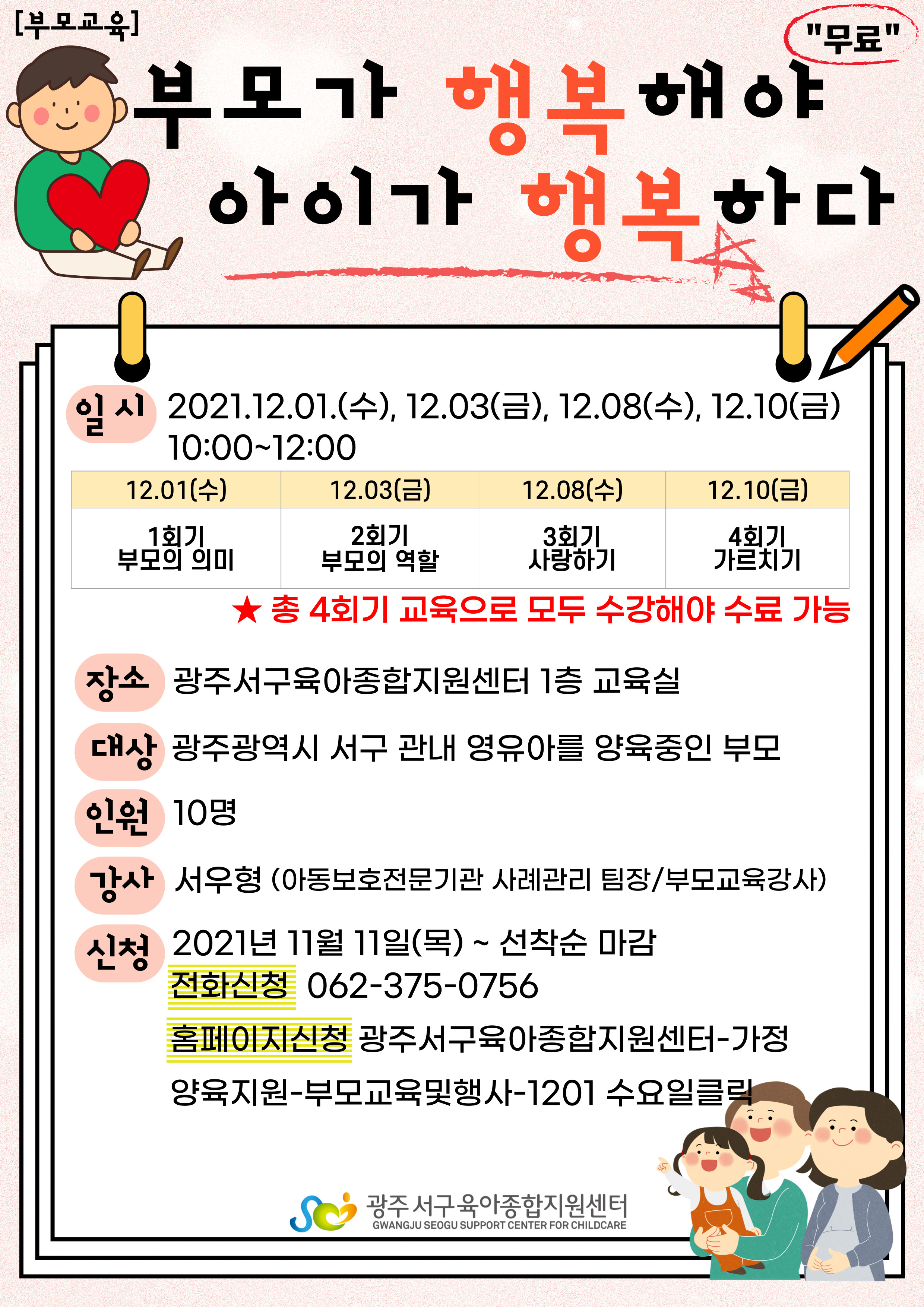 [광주서구육아종합지원센터] 12월 센터 부모 교육 안내 등록일 : 2021-11-24 15:20 작성자 : 서구건강가정다문화가족지원센터 조회수 : 517 첨부파일 [광주서구육종] 12월 센터 일정 안내001.jpg 다운로드 첨부파일 [12월부모교육] 부모가행복해야아이가행복하다.jpg 다운로드 신청방법 :서구육아종합지원센터 062-375-0756 (내선3번)온라인신청(광주서구육아종합지원센터 홈페이지 - 로그인 - 가정양육지원 - 부모교육 및 행사 - 해당날짜 클릭) 목록