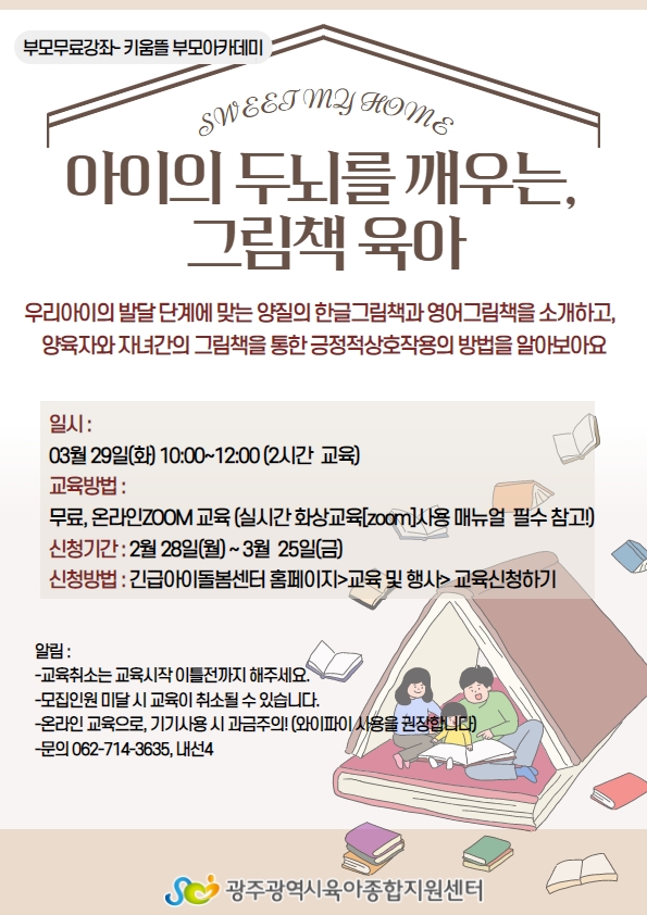 [광주육아종합지원센터] 부모무료강좌(키움뜰 부모교육)- 교육명: 아이의 두뇌를 깨우는, 그림책 육아 등록일 : 2022-02-28 13:29 작성자 : 광주육아종합지원센터 조회수 : 264 목록