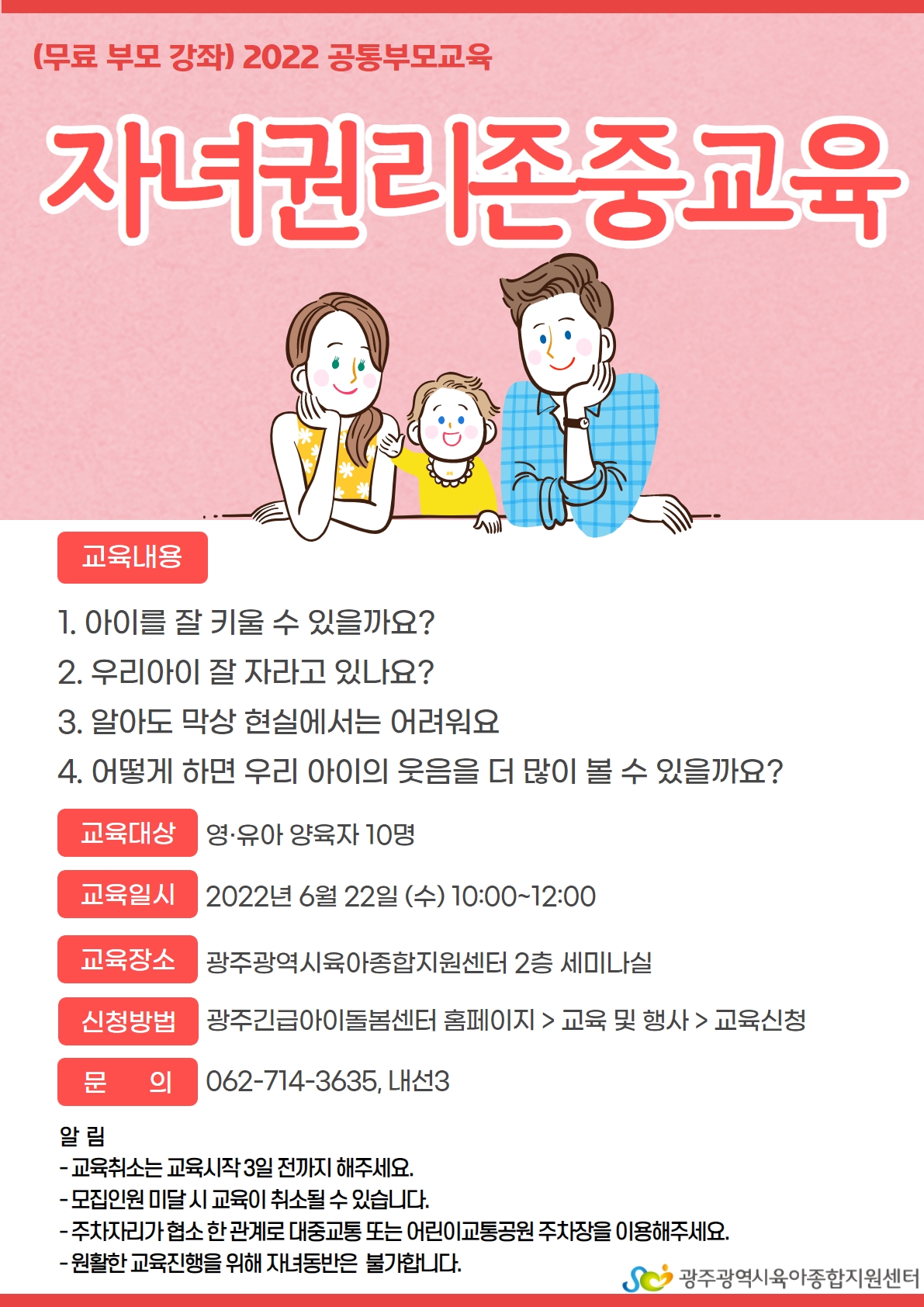[광주육아종합지원센터] 6월 공통부모교육 등록일 : 2022-05-10 11:09 작성자 : 광주육아종합지원센터 조회수 : 233 [광주긴급아이돌봄센터 홈페이지] - [교육및행사]에서 신청가능합니다!많은 관심과 신청 바랍니다 목록