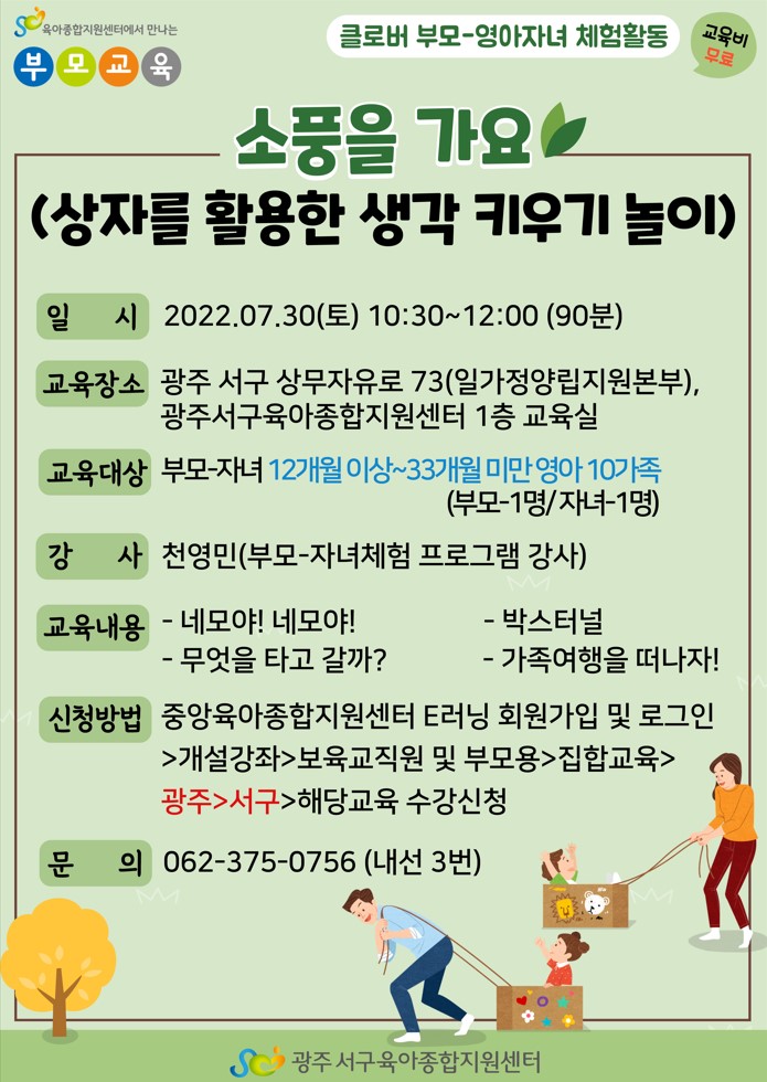 [광주서구육아종합지원센터] [공통 부모교육] 부모-자녀체험 소풍을 가요(상자를 활용한 생각 키우기 놀이) 등록일 : 2022-06-23 18:03 작성자 : 서구육아종합지원센터 조회수 : 242 목록