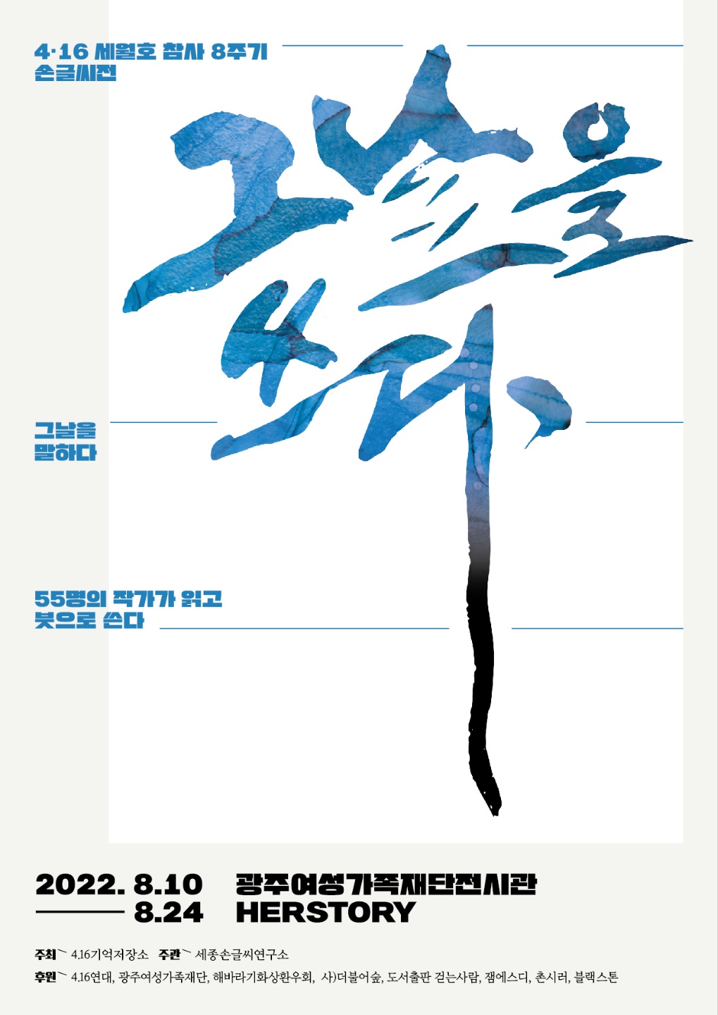 광주여성가족재단 전시관에서는 4.16 세월호 참사8주기 손글씨전 <그날을 쓰다>전시를 2022. 8. 10 ~ 8. 24까지 진행 예정입니다.