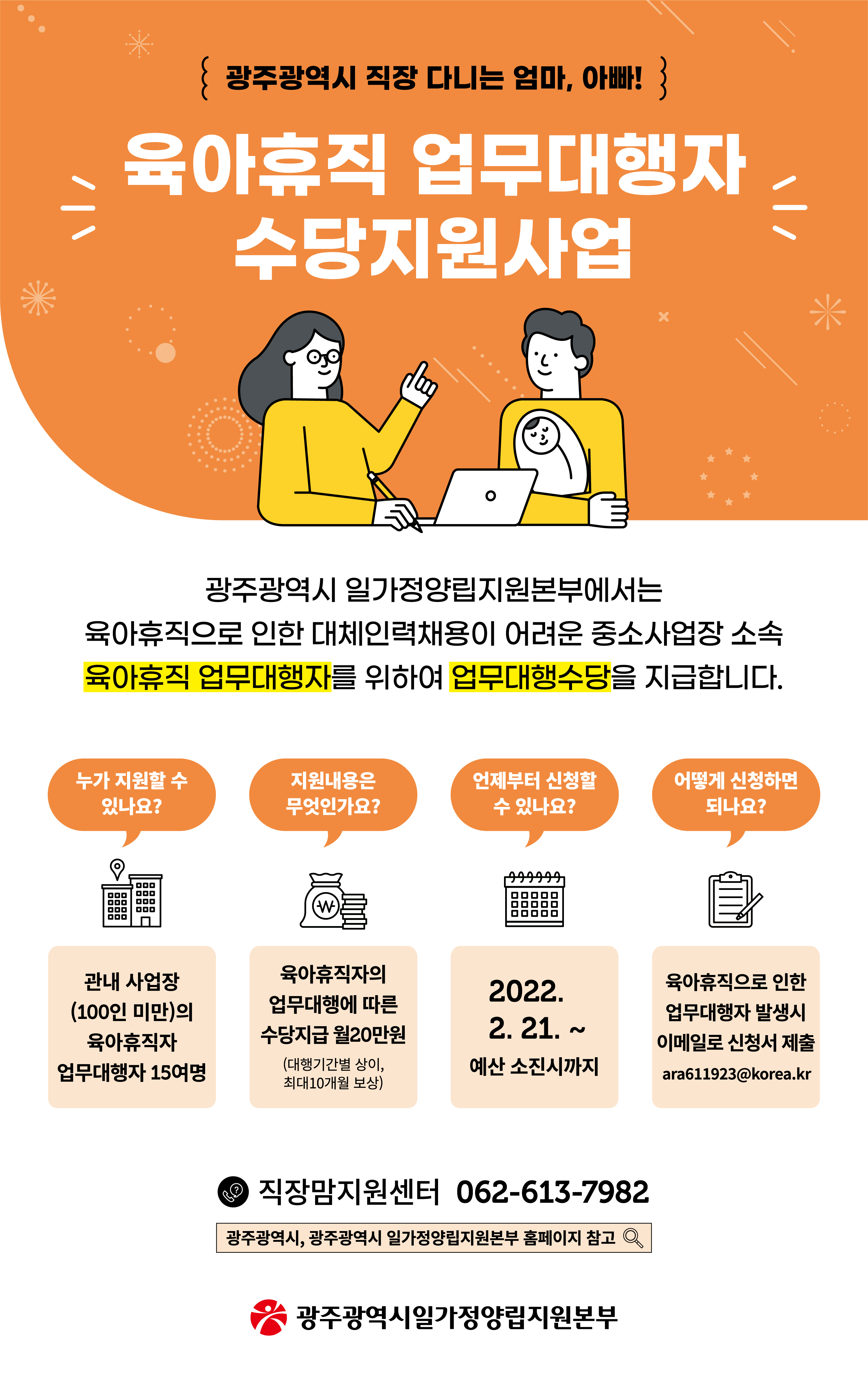 광주광역시 일가정양립지원본부 직장맘지원센터 사업 안내 등록일 : 2022-02-21 10:37 작성자 : 운영자 조회수 : 240 임산부 직장맘 고용유지지원사업육아기근로시간 단축 근로자 연차보상 지원사업초등입학기 10시 출근제 도입 중소사업장 장려금육아휴직 업무 대행자 수당지원사업 목록