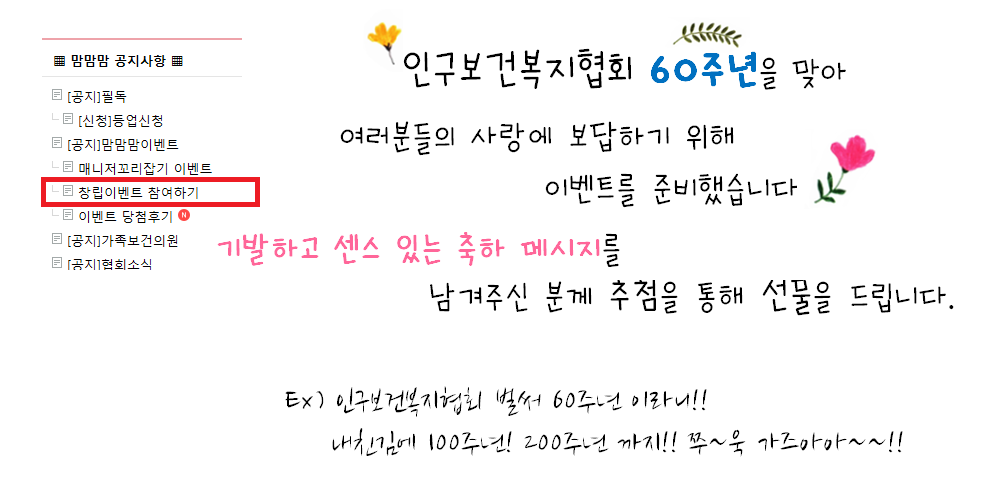 인구보건복지협회 60주년 기념 축하 이벤트 등록일 : 2021-03-30 10:59 작성자 : 인구보건협회 조회수 : 494 자세한 사항은 네이버 카페 " 맘맘맘 광주전남" 검색하시면 됩니다. https://cafe.naver.com/mammammamgwangju 목록