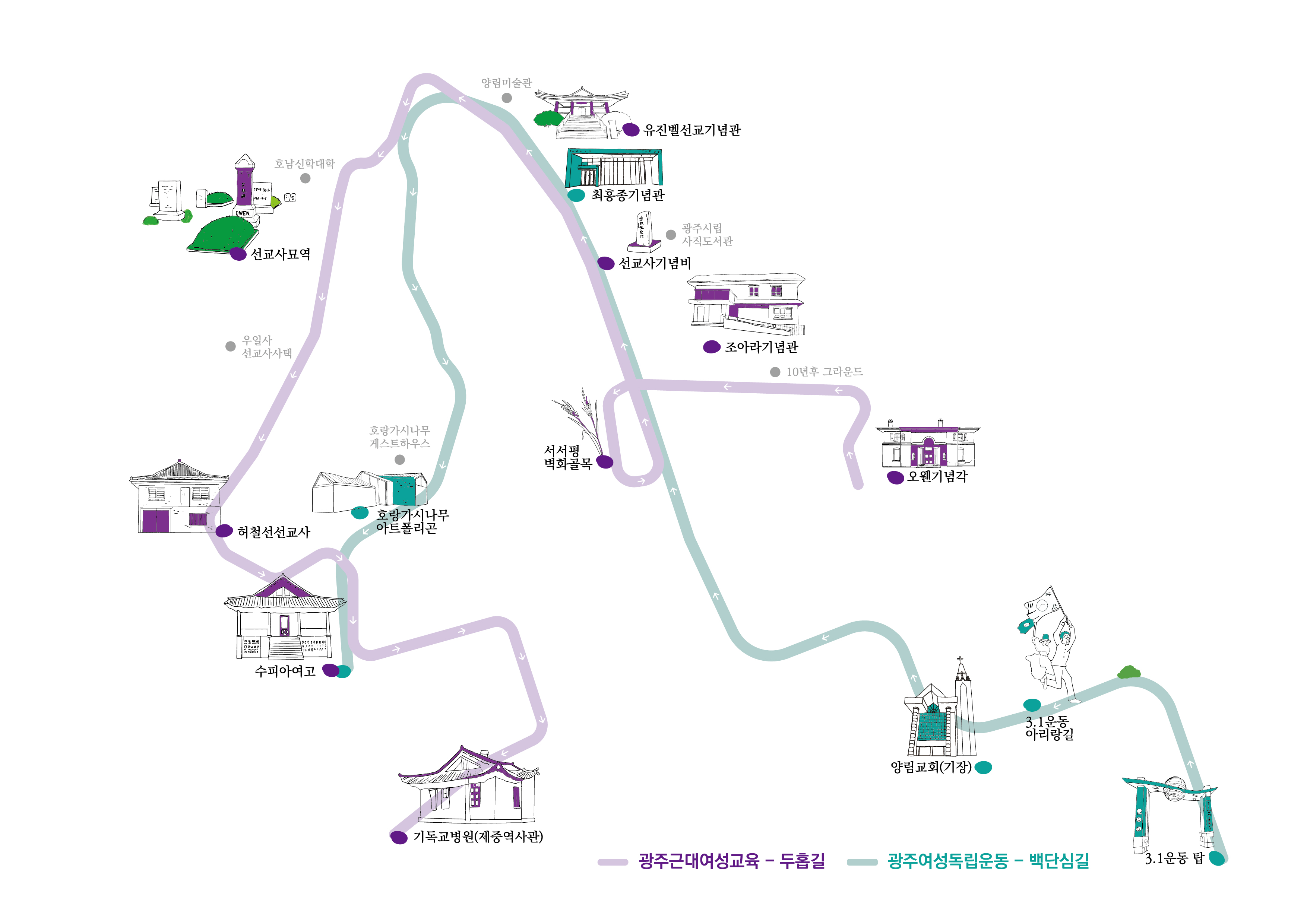 오웬기념각(출발) → 조아라기념관 → 서서평벽화골목 → 선교사기념비 →유진벨선교기념관 → 선교사묘역→ 허철선허마리아 선교사 사택 → 수피아여고