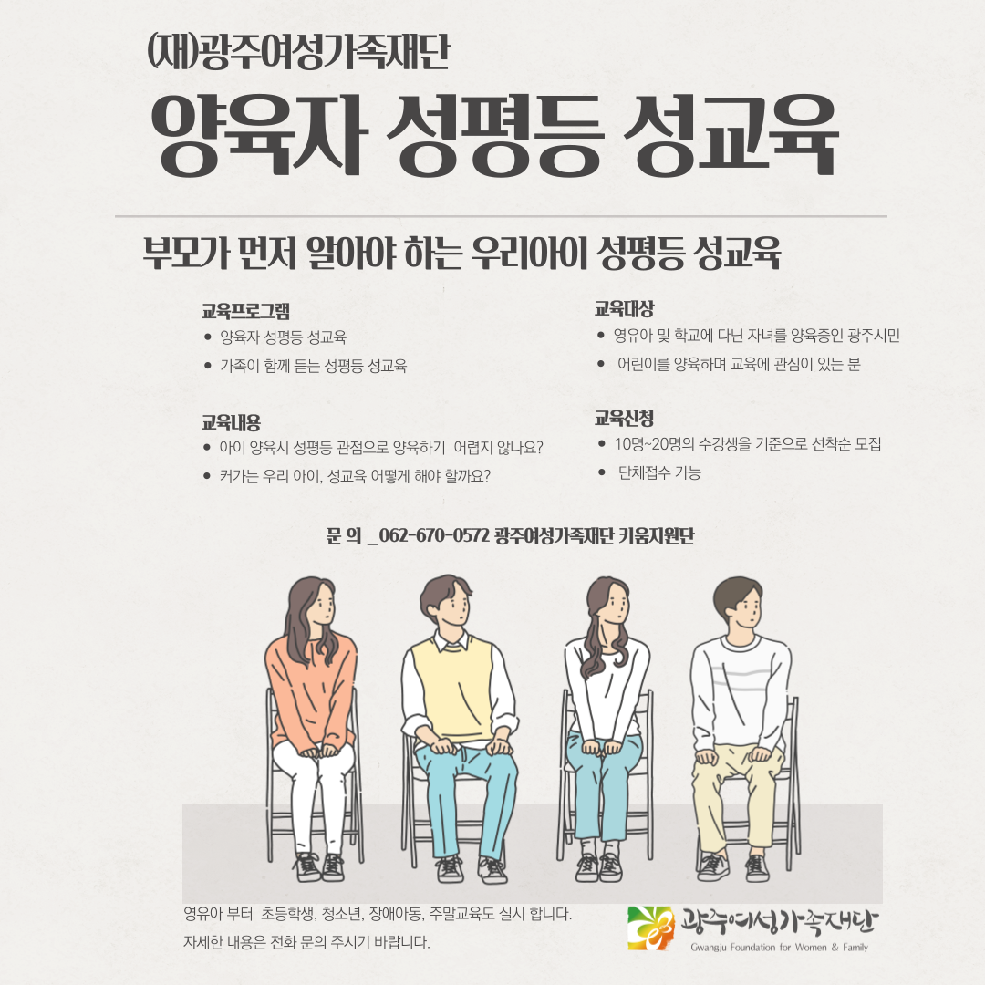 (재)광주여성가족재단 양육자 성평등 성교육 교육생 모집 등록일 : 2023-02-27 15:54 작성자 : 운영자 조회수 : 121 문의) 광주여성가족재단 키움지원단 062-670-0572 목록