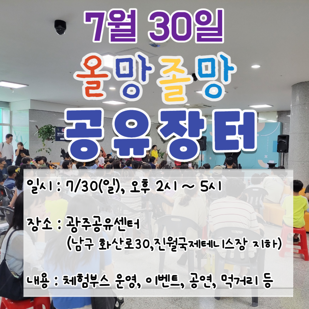 7월 올망졸망 공유장터 등록일 : 2023-07-18 10:51 작성자 : 광주공유센터 조회수 : 75 일시 : 2023년 7월월 30일 (일) 오후 2시 ~ 5시장소 : 광주공유센터 실내 (남구 화산로 30)대상 : 광주시민이라면 누.구.나 목록