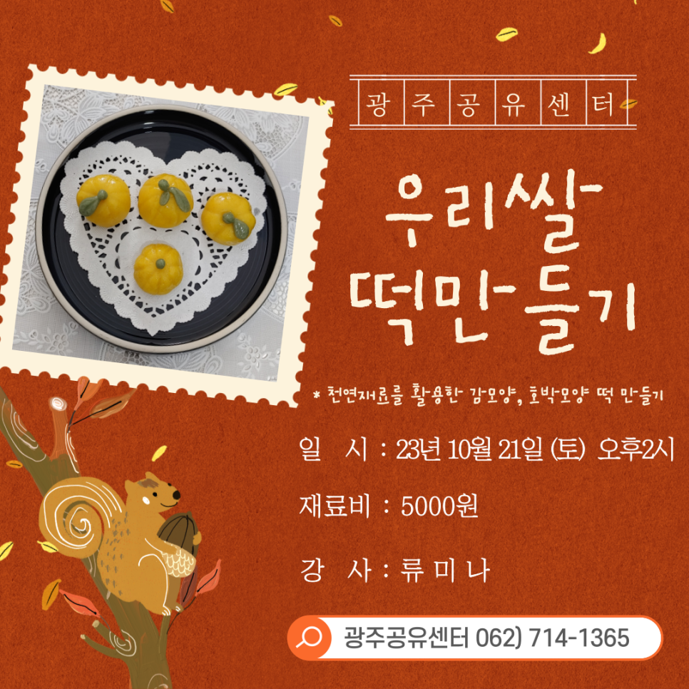 [재능공유] 우리쌀 떡만들기 등록일 : 2023-10-11 14:41 작성자 : 광주공유센터 조회수 : 146 천연재료를 활용해서 만드는떡 체험이 준비되어있습니다~!!감모양, 호박모양으로 만들어서더욱 맛있어 보이는 떡 만들기 체험 !!지금 바로 신청하세요 :D...일시 : 2023년 10월 21일 (토) 오후2시장소 : 광주공유센터 (남구 화산로30)재료비 : 5천원접수 및 문의는062)714-1365입니다. 목록