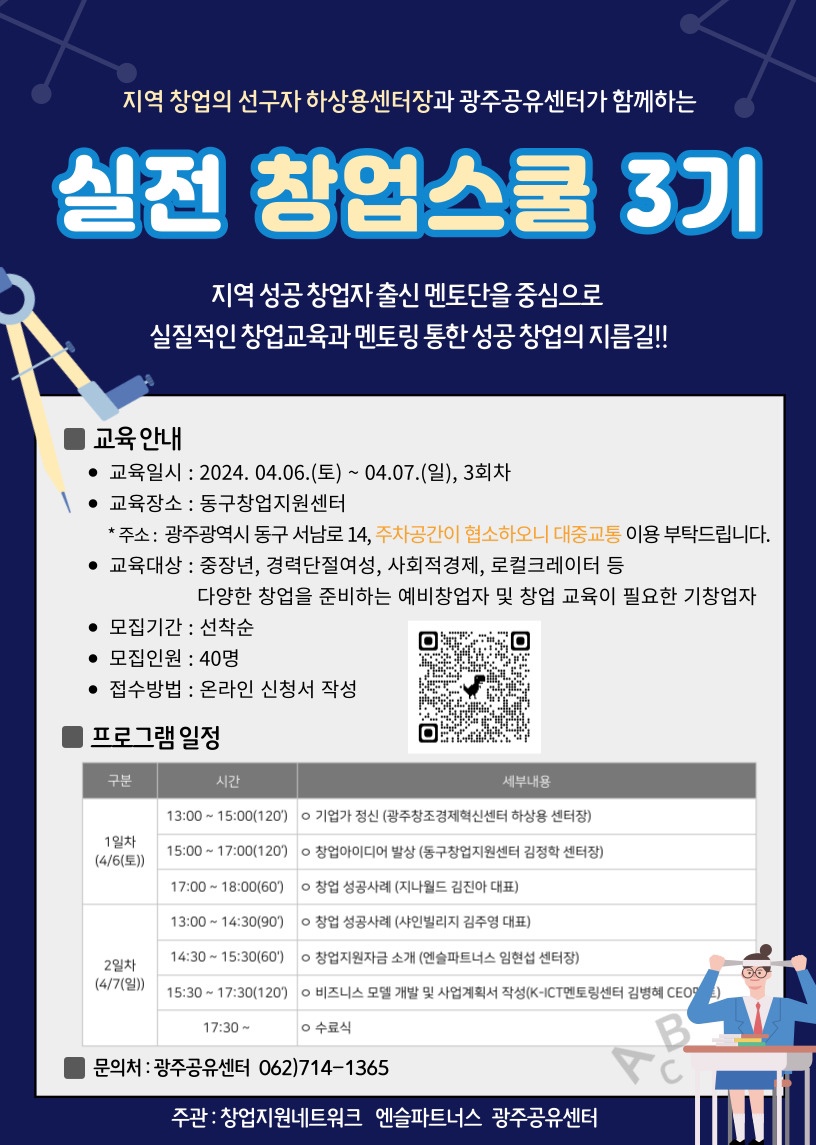 [광주공유센터] 실전 창업스쿨 3기 모집 안내 등록일 : 2024-03-28 15:00 작성자 : 운영자 조회수 : 100 광주공유센터가 함께하는 '실전 창업스쿨' 3기를 모집합니다. 지역 성공 창업자 출신 멘토단을 중심으로실질적인 창업교육과 멘토링을 통한 성공 창업의 지름길에 관심있는 여러분의 많은 참여와 호응 바랍니다. ○ 문의 : 광주공유센터 062-714-1365 목록