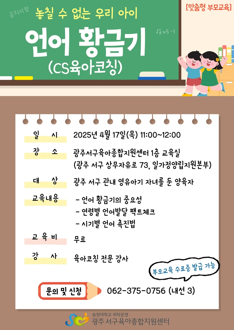 [광주서구육아종합지원센터] 맞춤형 부모교육-놓칠 수 없는 우리 아이 언어 황금기(cs육아코칭) 등록일 : 2025-03-17 14:15 작성자 : 서구육아종합지원센터 조회수 : 38 목록