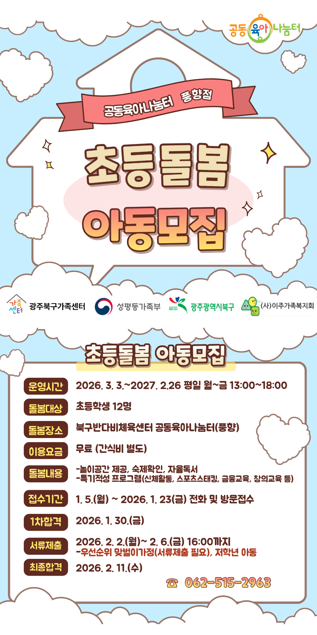 [북구가족센터] 공동육아나눔터 풍향_👧2026 초등돌봄 아동모집🧒