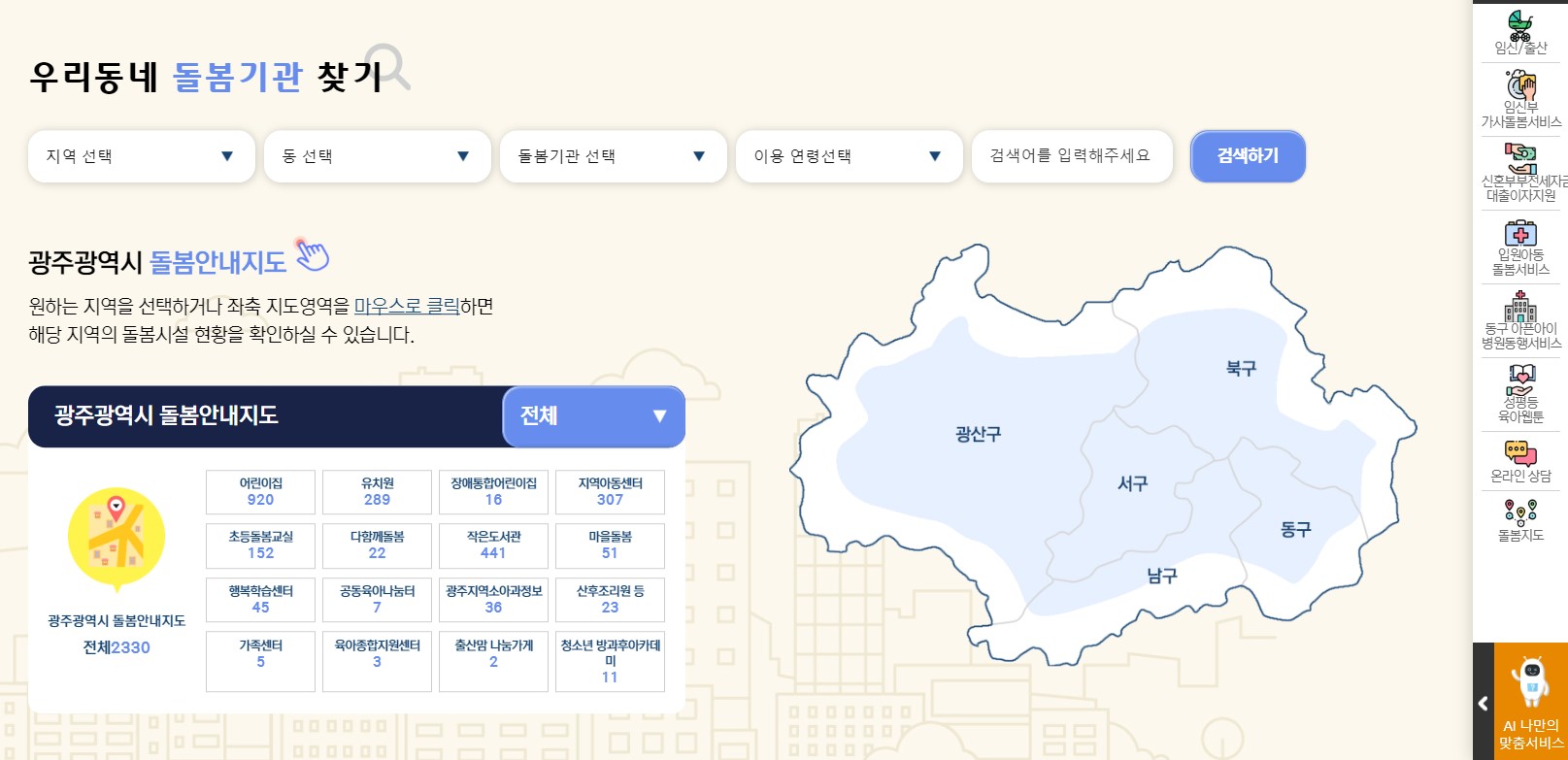다함께 돌봄센터 또는 지역아동센터, 마을돌봄 등은 광주아이키움 돌봄지도 내에서 검색하실 수 있으며 구별로 검색하신 후 기관을 클릭하시면 자세한 기관정보를 알아보실 수 있습니다