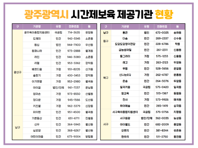 광주 내 시간제 보육 가능한 곳 목록을 알 수 있을까요?