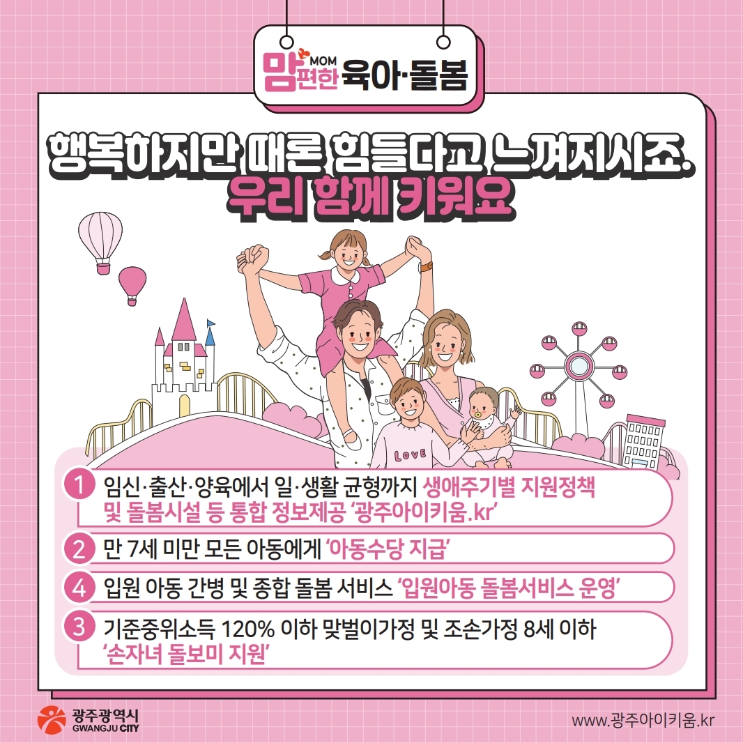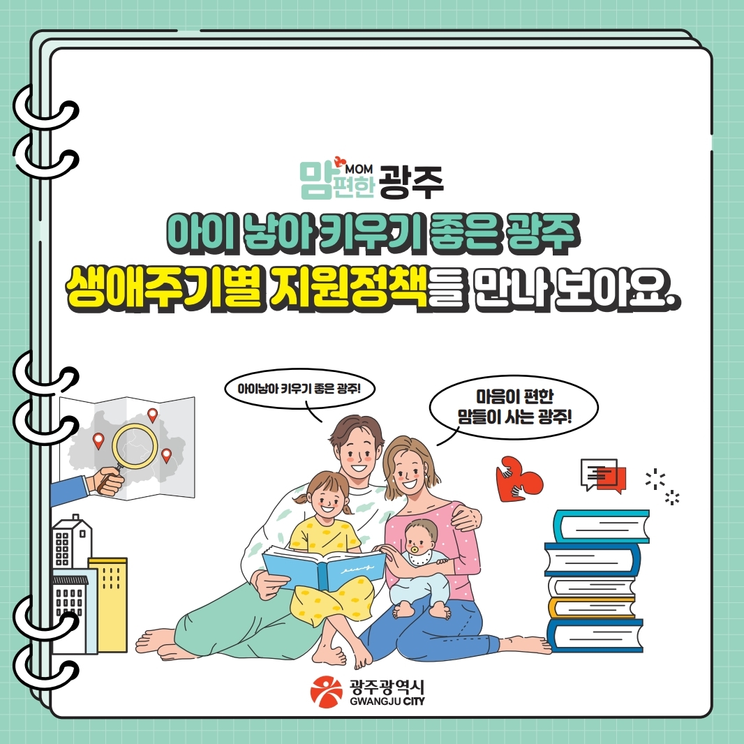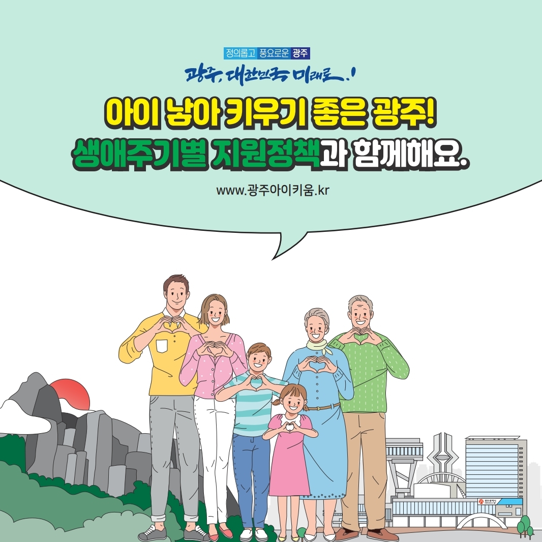 <맘MOM편한 광주> 아이 낳아 키우기 좋은 광주! 생애주기별 지원정책 ! -종합편 등록일 : 2021-06-02 15:49 작성자 : 운영자 조회수 : 4354 첨부파일 아이키우기좋은광주.JPG 다운로드 목록