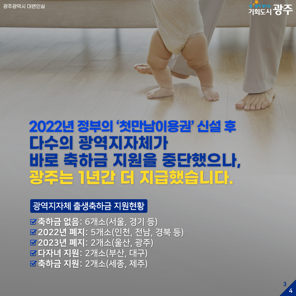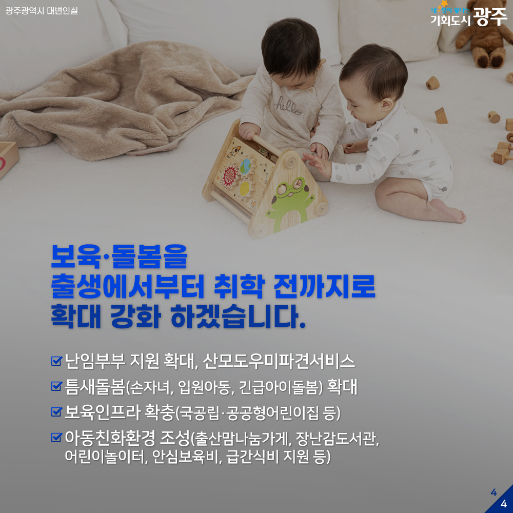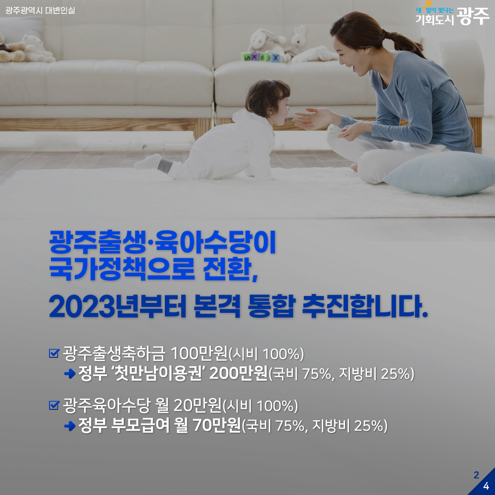 출산에 대한 국가 책임이 강화됨에 따라 광주는 보육과 돌봄에 더 주력하겠습니다. 등록일 : 2023-01-06 16:04 작성자 : 운영자 조회수 : 1312 첨부파일 01.JPG 다운로드 목록