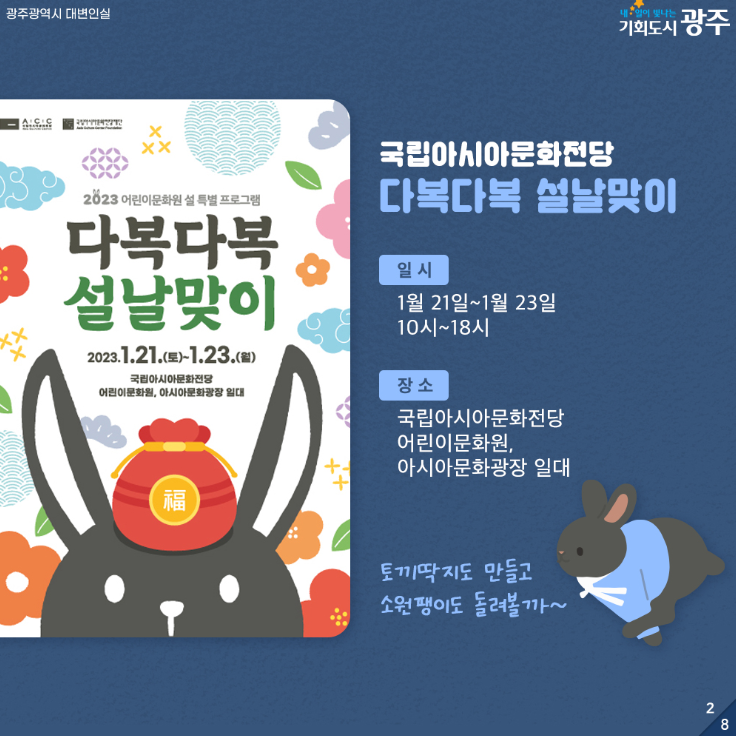 [광주광역시] 설맞이 문화행사 한눈에 보기 등록일 : 2023-01-20 09:31 작성자 : 운영자 조회수 : 712 첨부파일 화면 캡처 2023-01-20 092536.png 다운로드 목록