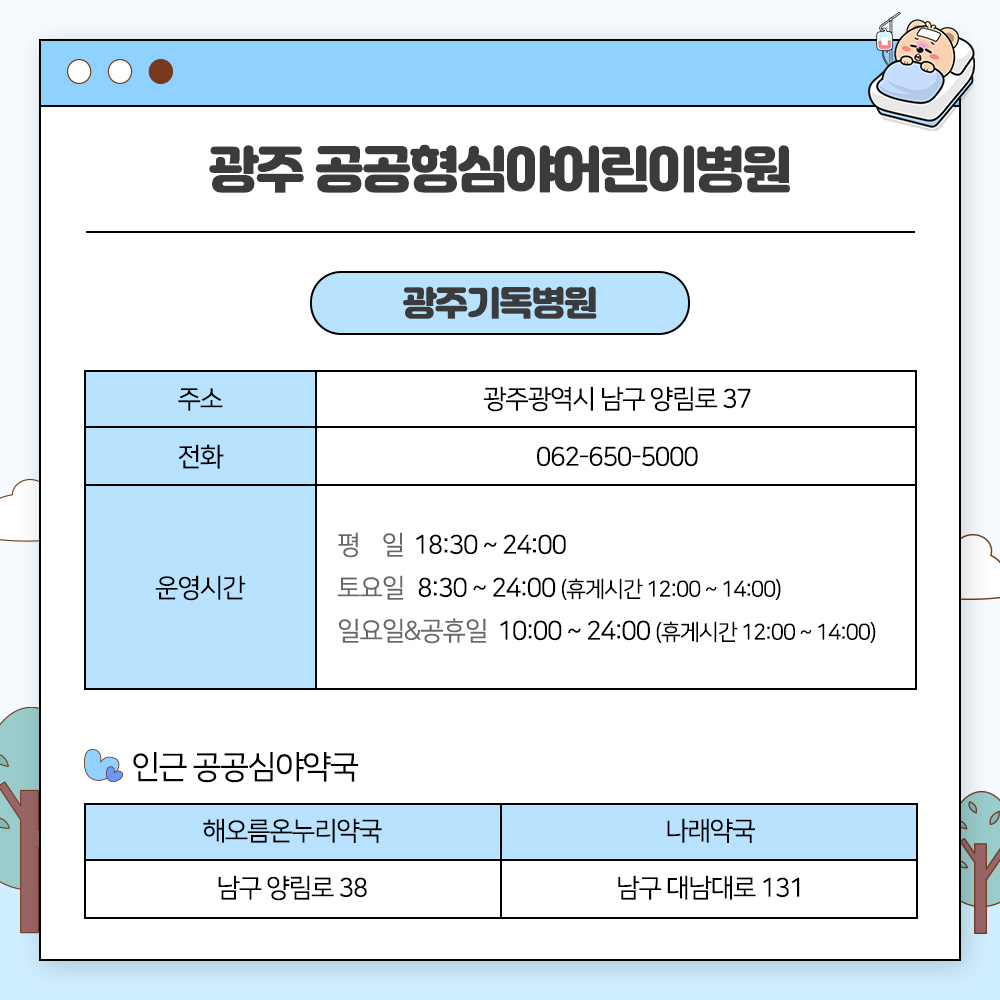 2024년에도 광주공공심야어린이병원 등록일 : 2024-03-11 10:19 작성자 : 운영자 조회수 : 939 첨부파일 KakaoTalk_20240227_160932067.jpg 다운로드 목록